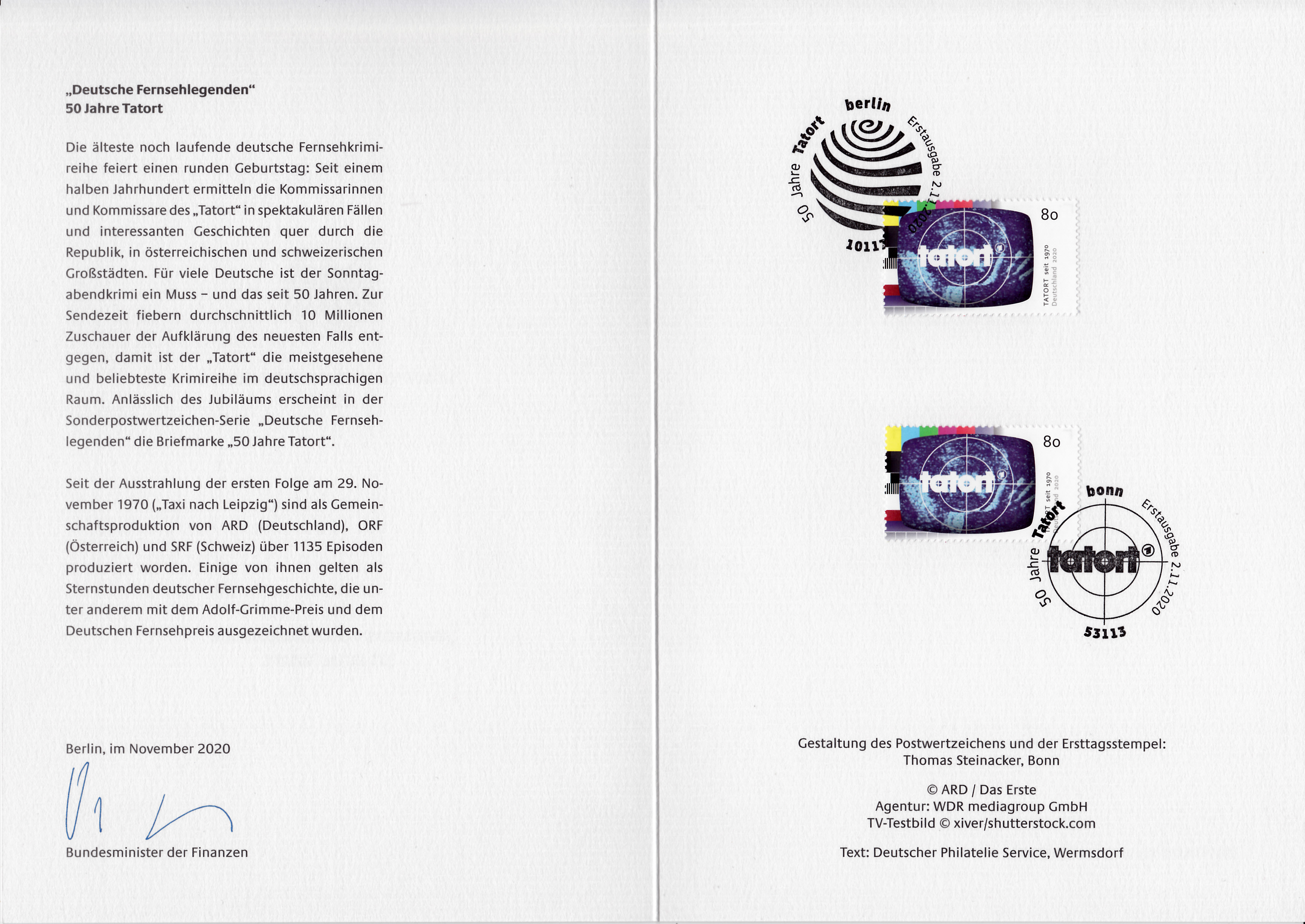 Klappkarte des Vorstandsvorsitzenden der Deutschen Post AG mit einer Marke aus der Serie "Deutsche Fernsehlegenden" (MiNr 3572) mit dem Motiv "Tatort" und mit den Ersttagsonderstempel Bonn.