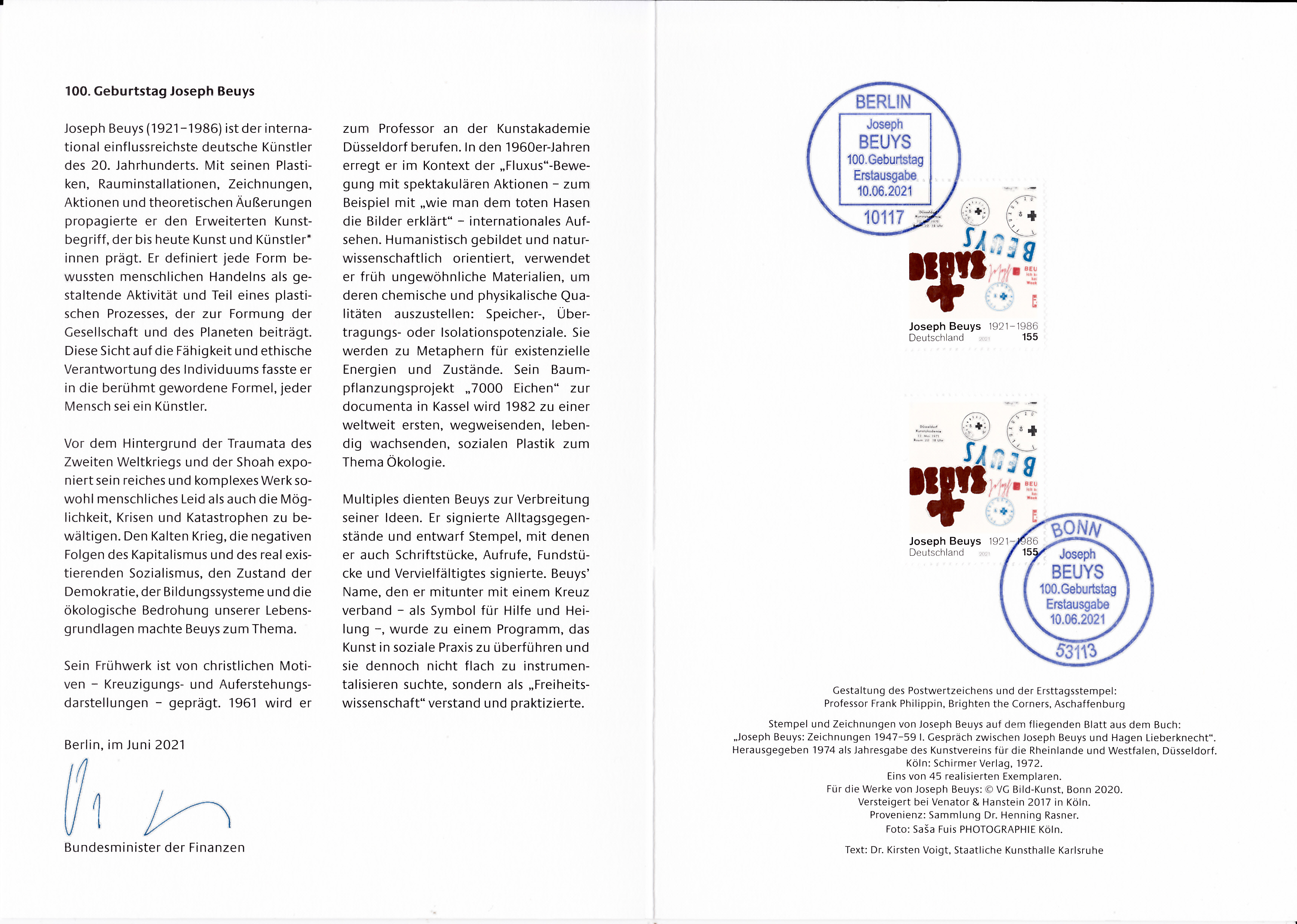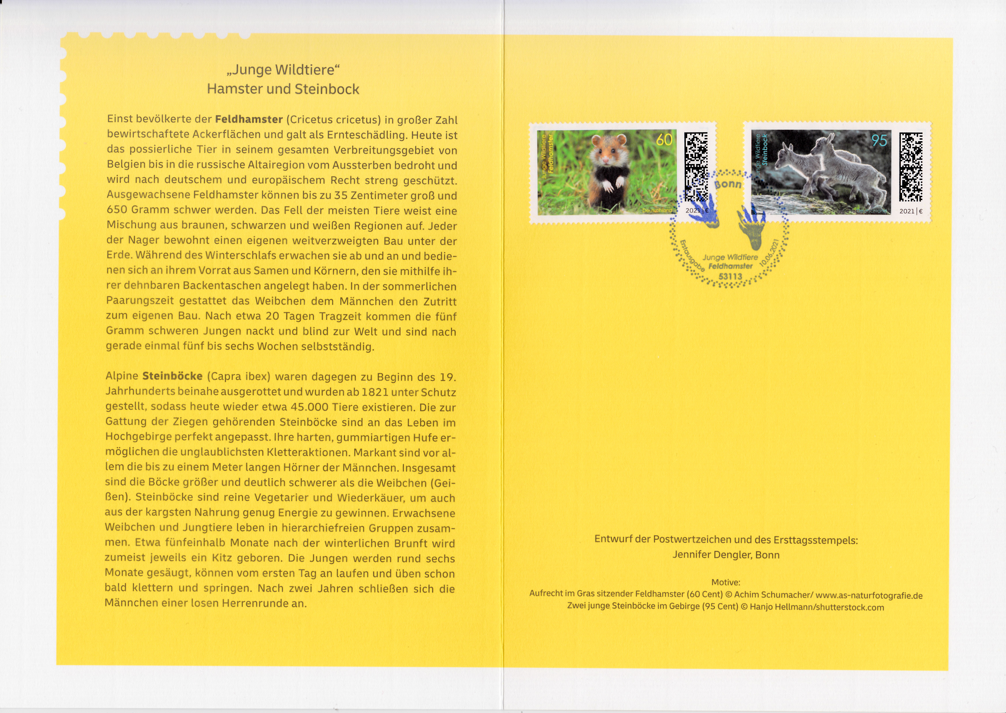 Ministerkarte des Finanzministers mit je einer Marke der Serie "Tierbabys" (MiNr 3608/3609) mit Motiven "Feldhamster (Cricetus cricetus)" und "Alpensteinbock (Capra ibex)". Die Marken sind mit den jeweils passenden Ersttagsonderstempel Berlin und dem Ersttagsonderstempel Bonn gestempelt.