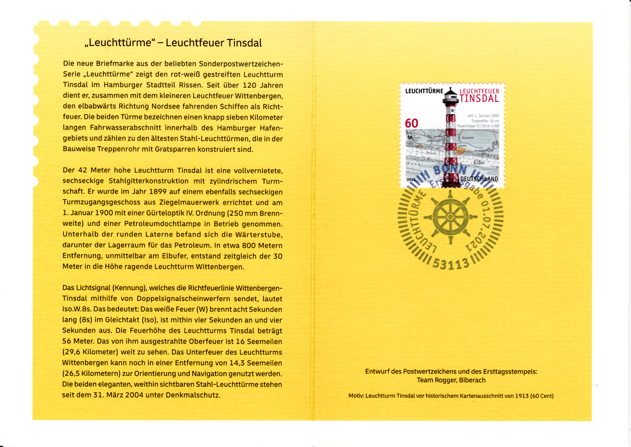 Klappkarte des Vorstandsvorsitzenden der Deutschen Post AG mit der Marke der Serie "Leuchttürme" der Deutschen Post (MiNr 3615) mit dem Motiv "Leuchtfeuer Tinsdal" und dem Ersttagsonderstempel Bonn.