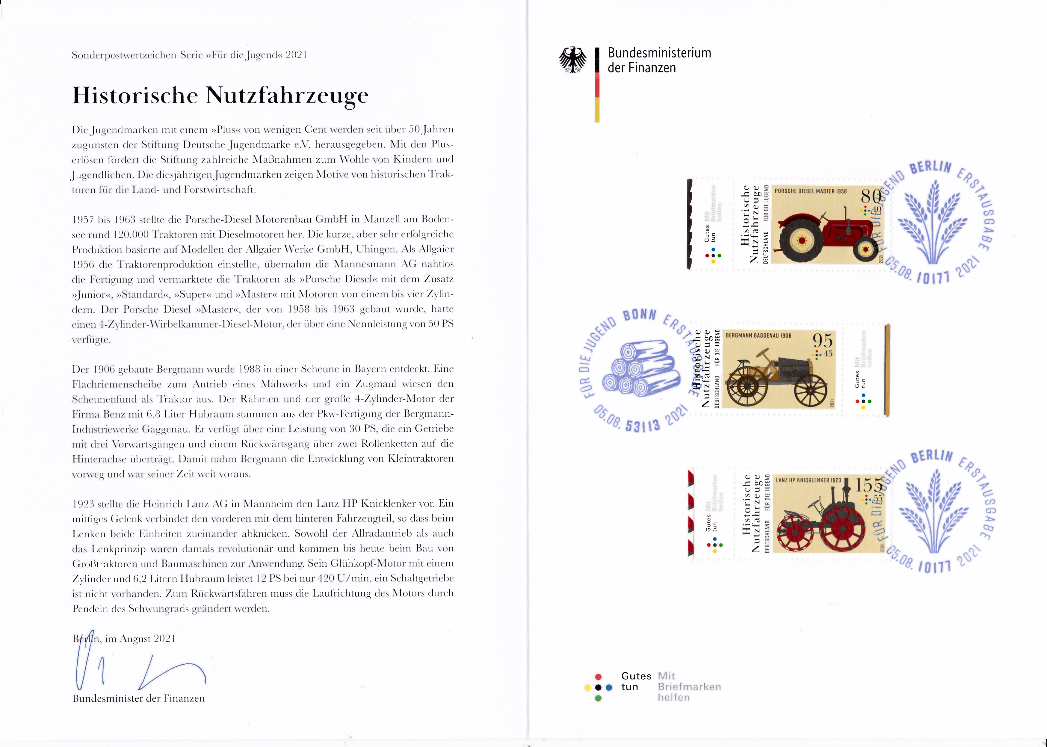 Farbige Ministerkarte des Finanzministers mit je einer Marke für die Jugend 2021 (MiNr 3618 bis 3620) mit Motiven zum Thema "Historische Traktoren". Zwei Marken sind mit den Ersttagsonderstempel Berlin gestempelt und eine Marke erhielt den Ersttagsonderstempel Bonn.
