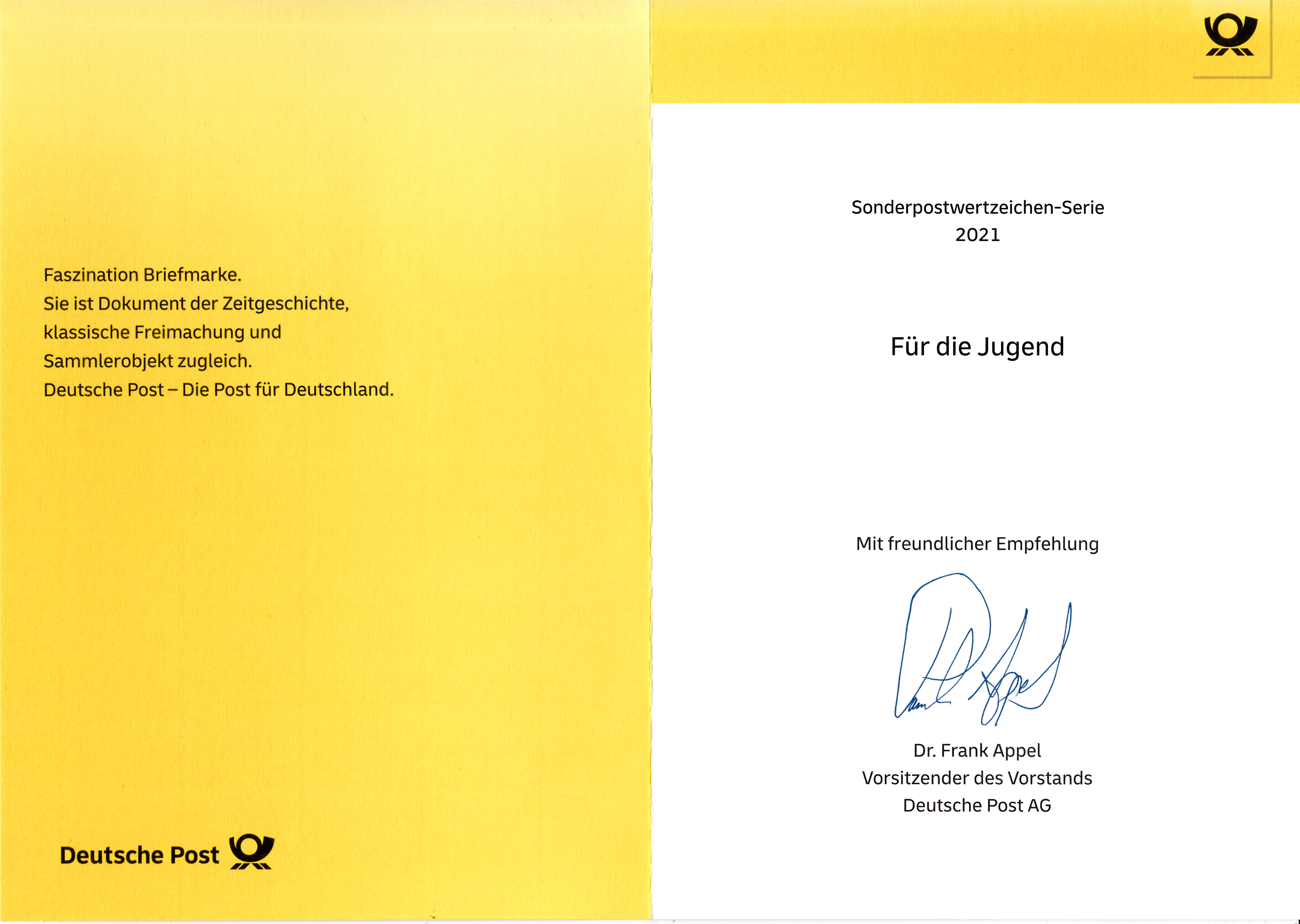 Klappkarte des Vorstandsvorsitzenden der Deutschen Post AG mit je einer Marke für die Jugend 2021 (MiNr 3618 bis 3620) mit Motiven zum Thema "Historische Traktoren" und dem Ersttagsonderstempel Bonn.