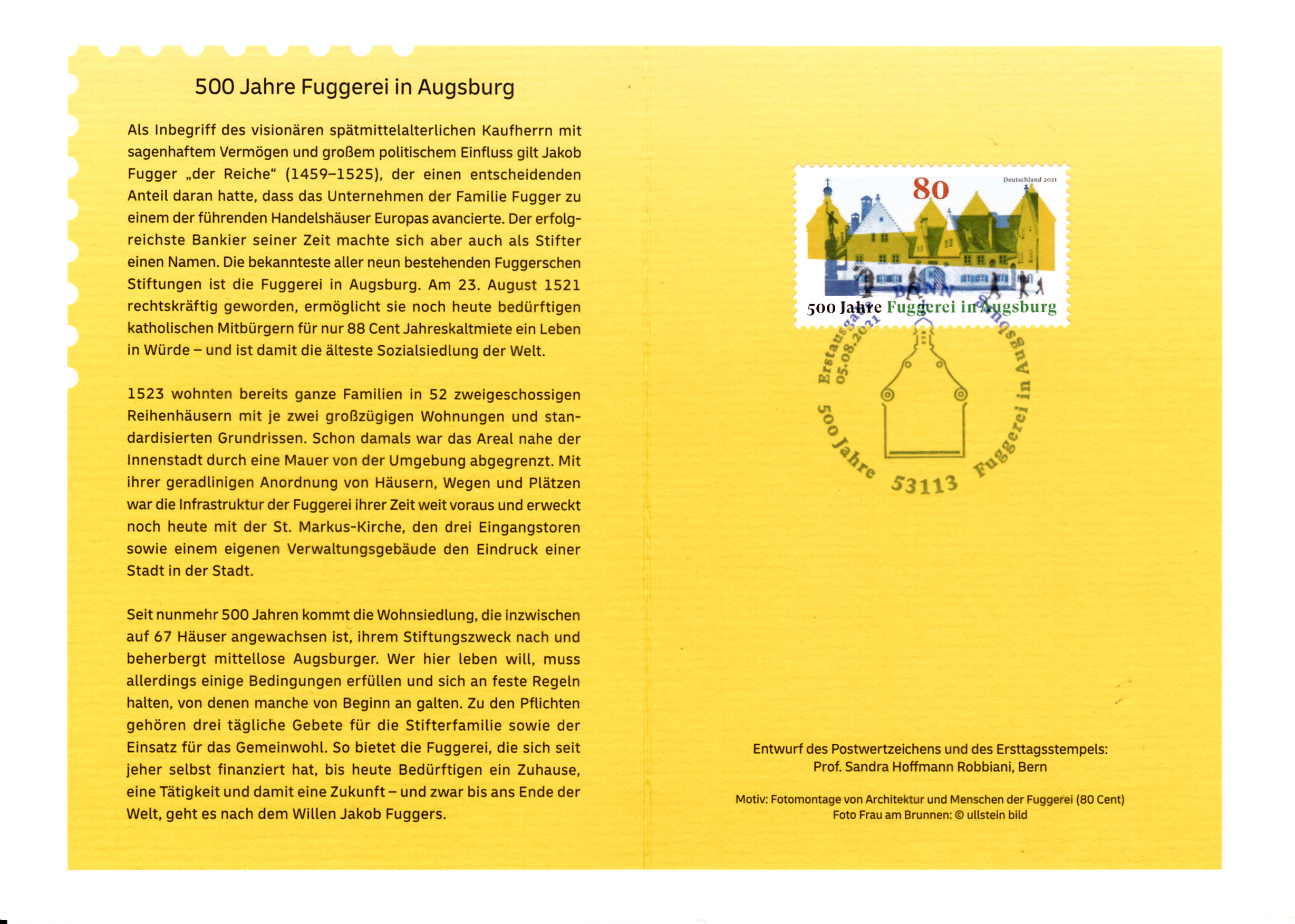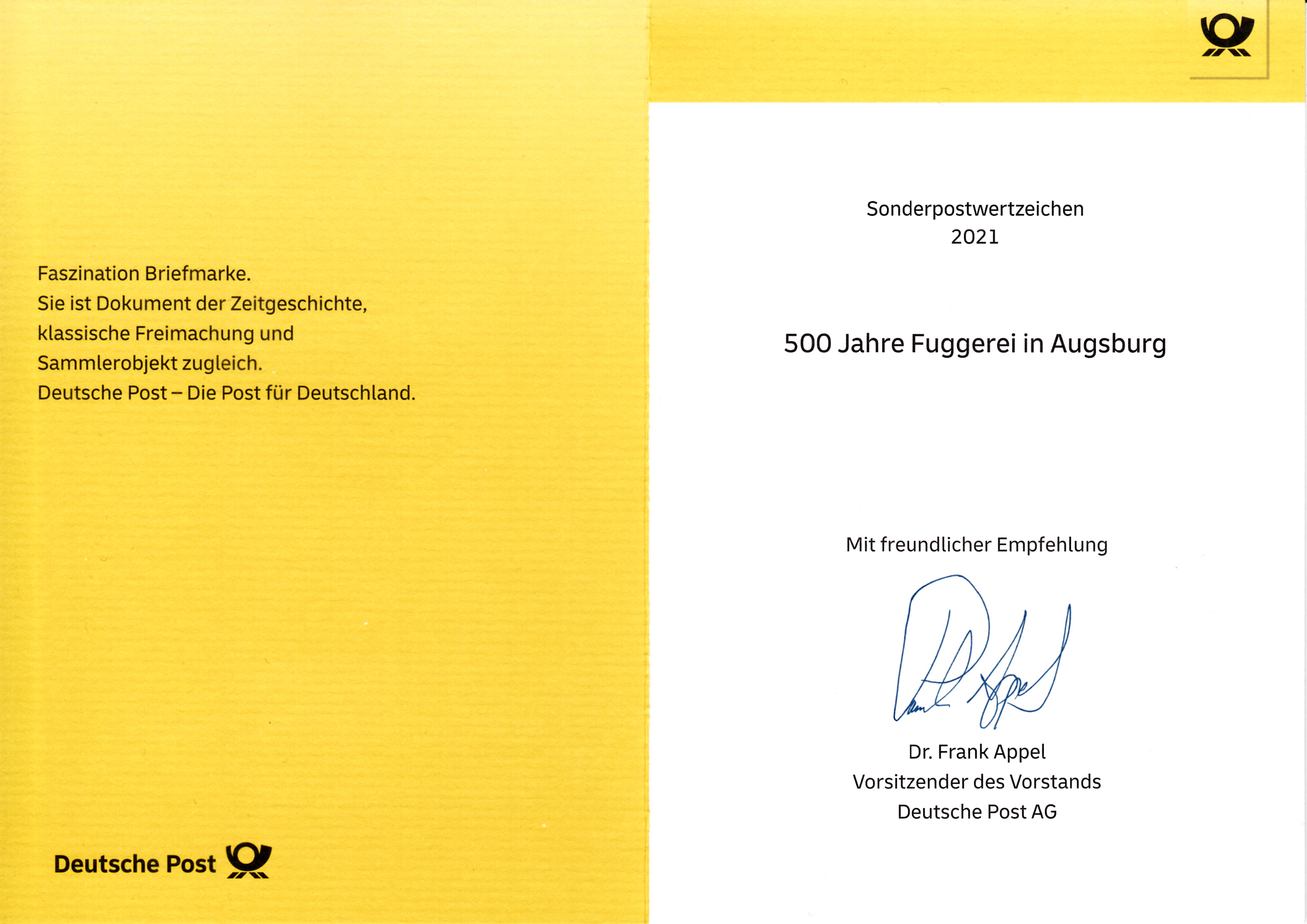 Klappkarte des Vorstandsvorsitzenden der Deutschen Post AG mit der Marke "500 Jahre Fuggerei in Augsburg" (MiNr 3621) und dem Ersttagsonderstempel Bonn.
