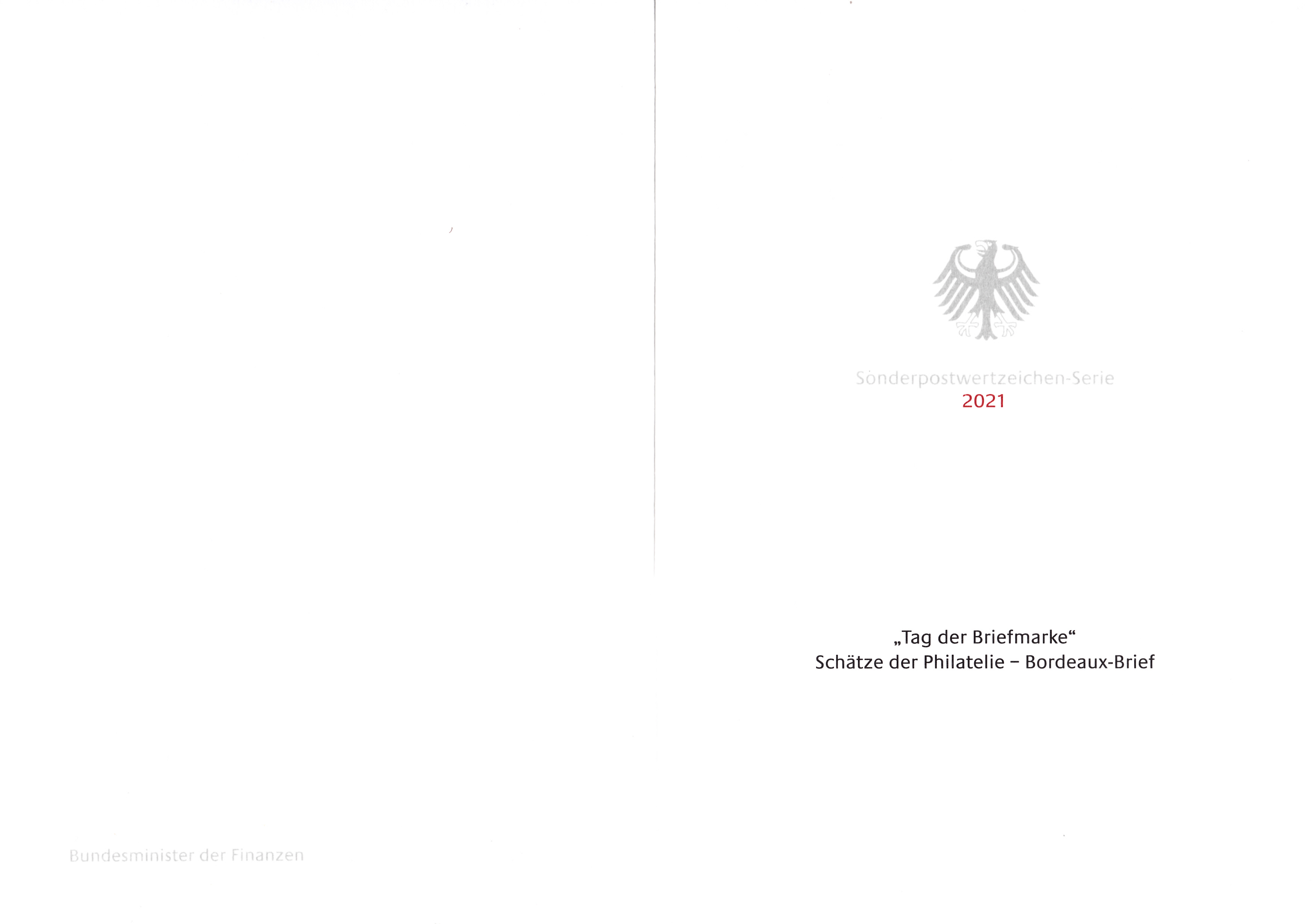Ministerkarte des Bundesministers für Finanzen mit zwei Marken der Deutschen Post (MiNr 3623) zum Tag der Briefmarke 2021 und den beiden Ersttagsonderstempel Bonn und Berlin.