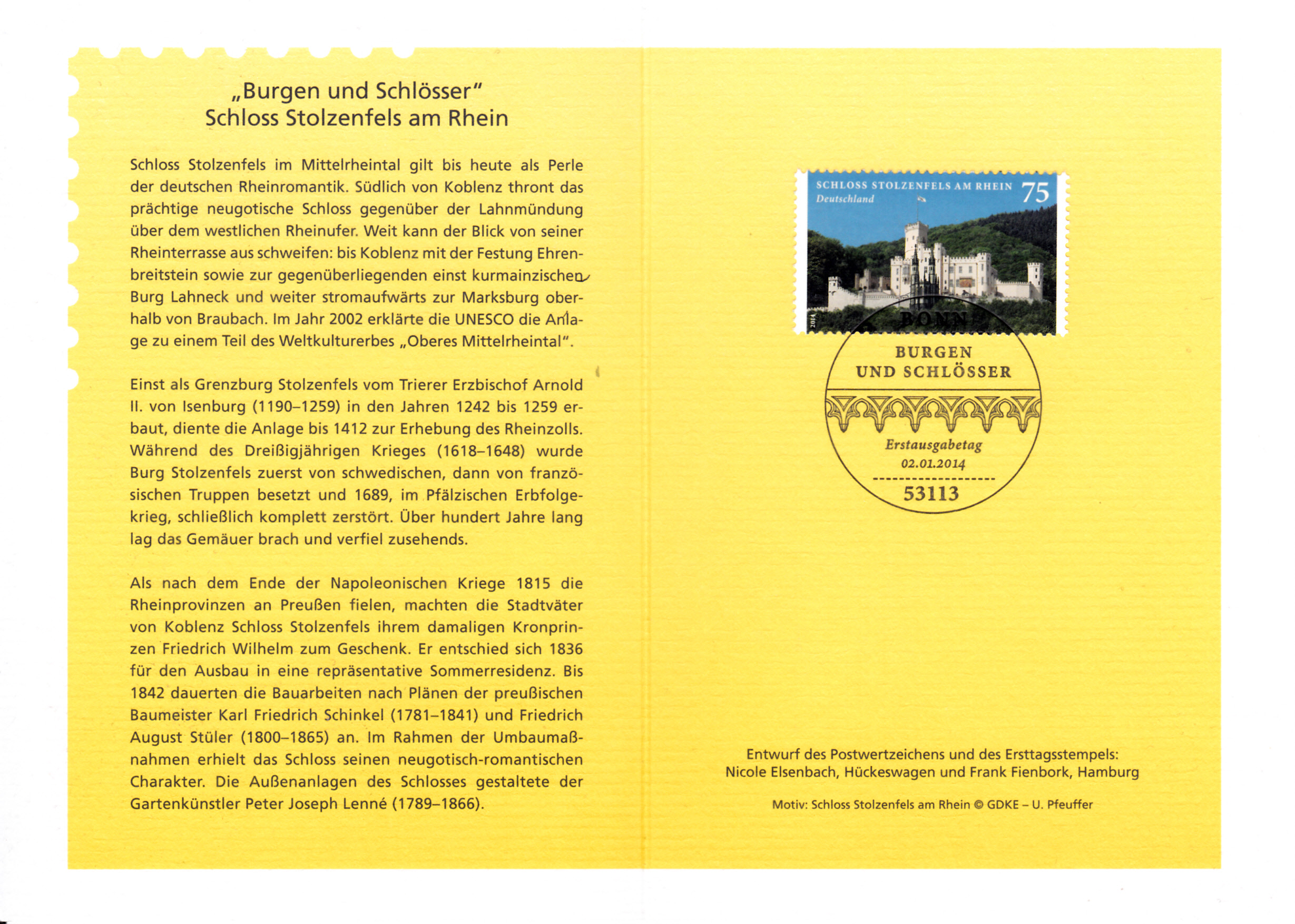 Klappkarte des Vorstandsvorsitzenden der Deutschen Post AG mit der Marke der Deutschen Post (MiNr 3049) "Schloss Stolzenfels am Rhein" aus der Serie "Burgen und Schlösser" und dem Ersttagsonderstempel Bonn.