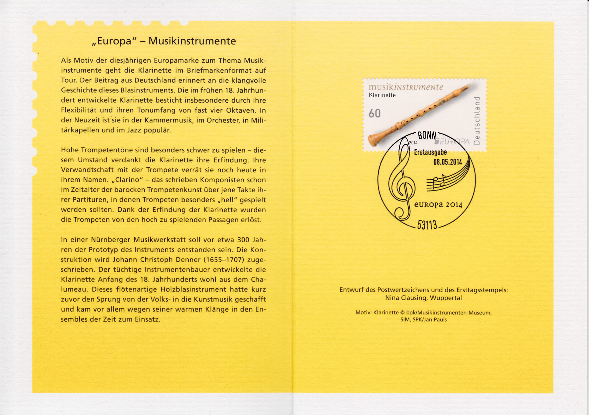 Klappkarte des Vorstandsvorsitzenden der Deutschen Post AG mit der Europamarke der Deutschen Post (MiNr 3078) mit der Abbildung einer Klarinette und dem Ersttagsonderstempel Bonn.