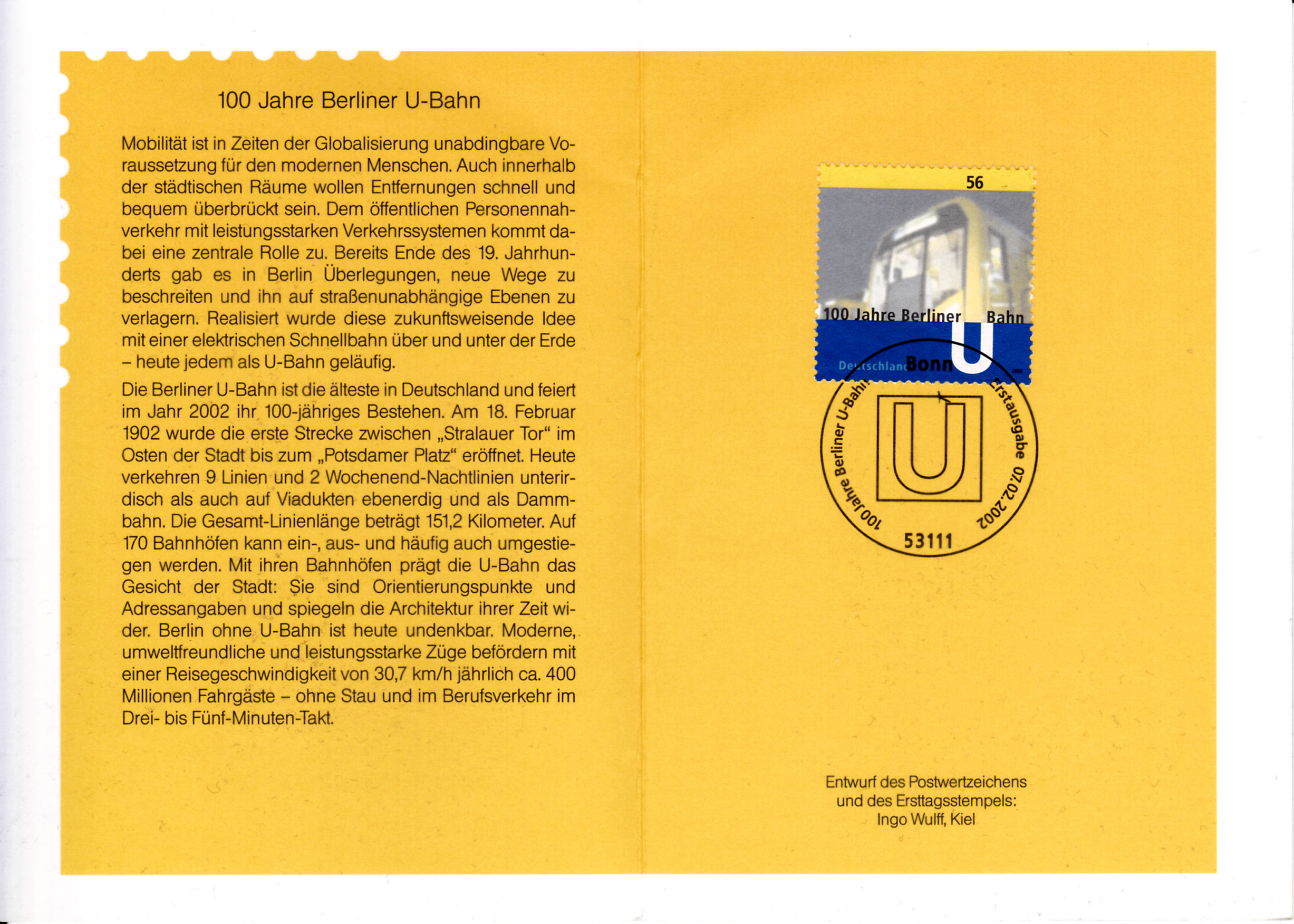 Klappkarte des Vorstandsvorsitzenden der Deutschen Post AG mit der Marke der Deutschen Post (MiNr 2242) "100 Jahre Berliner U-Bahn" und dem Ersttagsonderstempel Bonn.