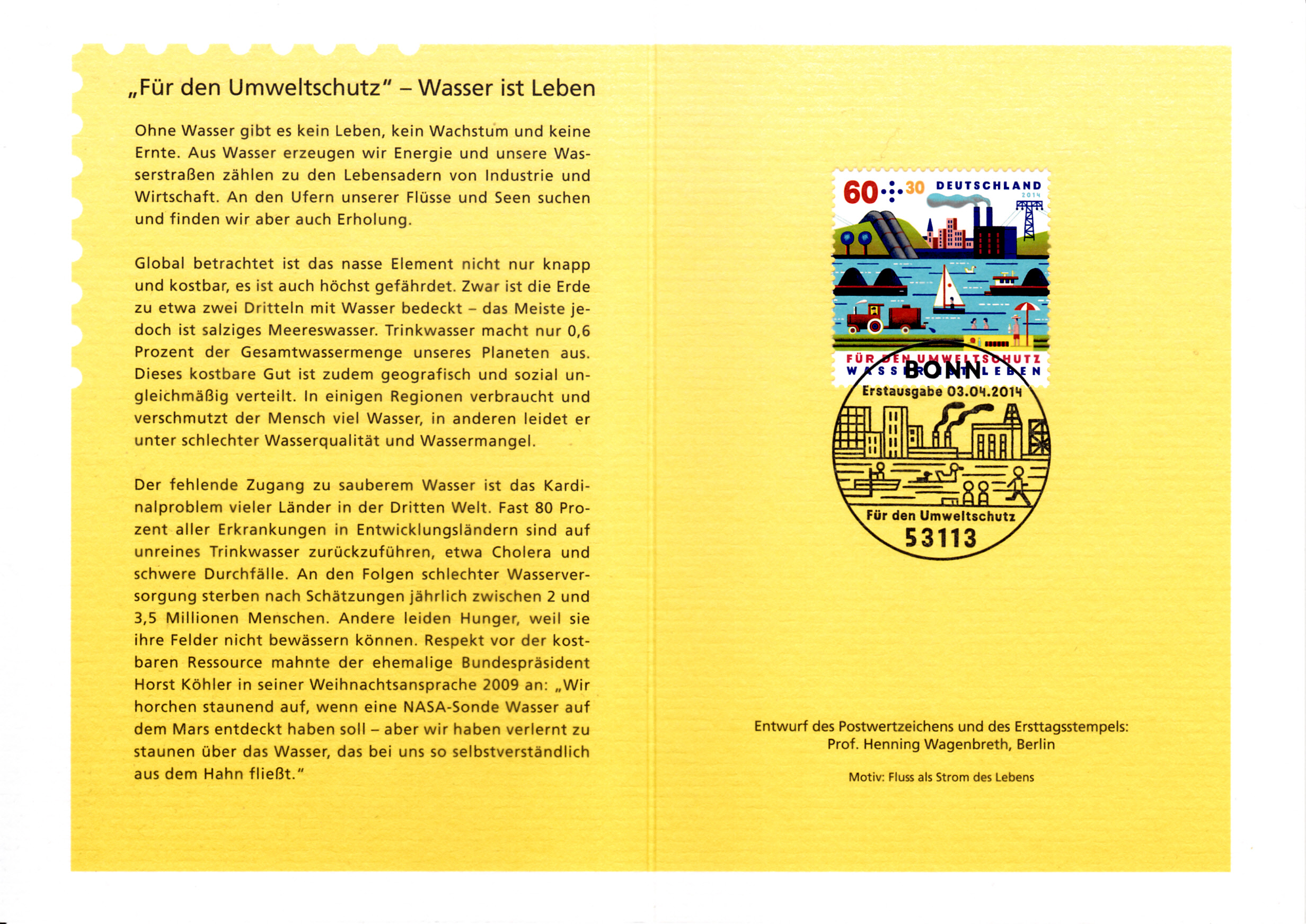 Klappkarte des Vorstandsvorsitzenden der Deutschen Post AG mit der Marke der Deutschen Post (MiNr 3067) "Umweltschutz: Wasser ist Leben" mit dem Motiv "Gefahren der Wasserverschmutzung" und dem Ersttagsonderstempel Bonn.