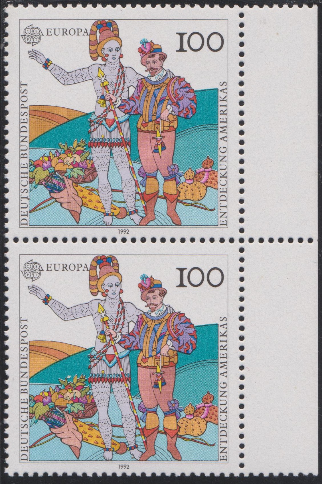 Hier ein Zweierstreifen vom rechten Rand, Feld 15 und Feld 20, wobei die obere Marke Feld 15 den Plattenfehler zeigt: