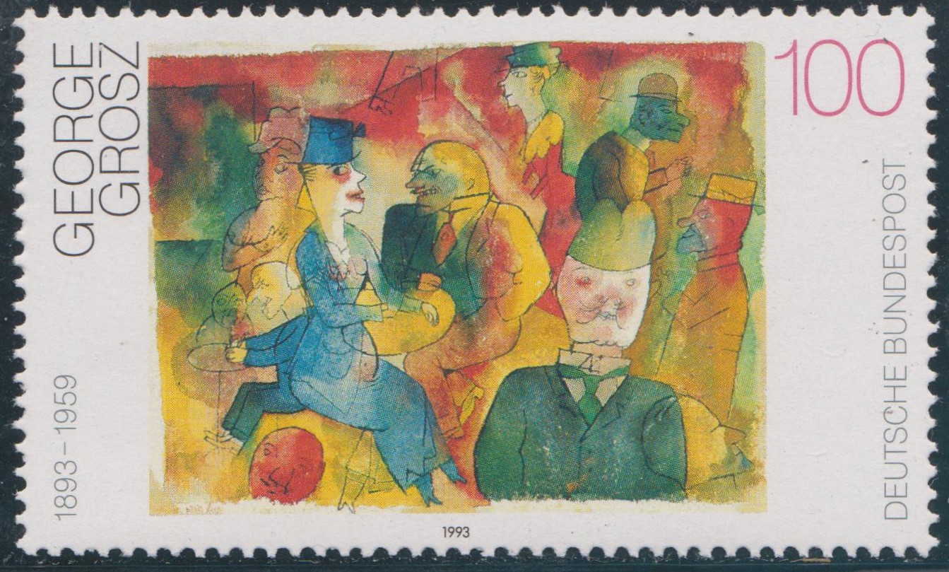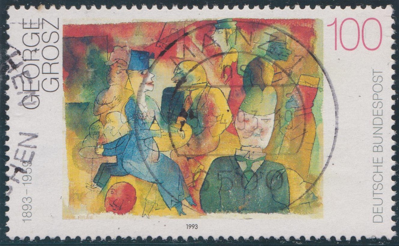 Hier der Plattenfehler Bund MiNr. 1656 I: "zwei braune Flecken auf der Jacke des Mannes im Vordergrund", der bei einer Teilauflage auf Feld 19 des Bogens mit der Formnummer "2" zu finden ist: