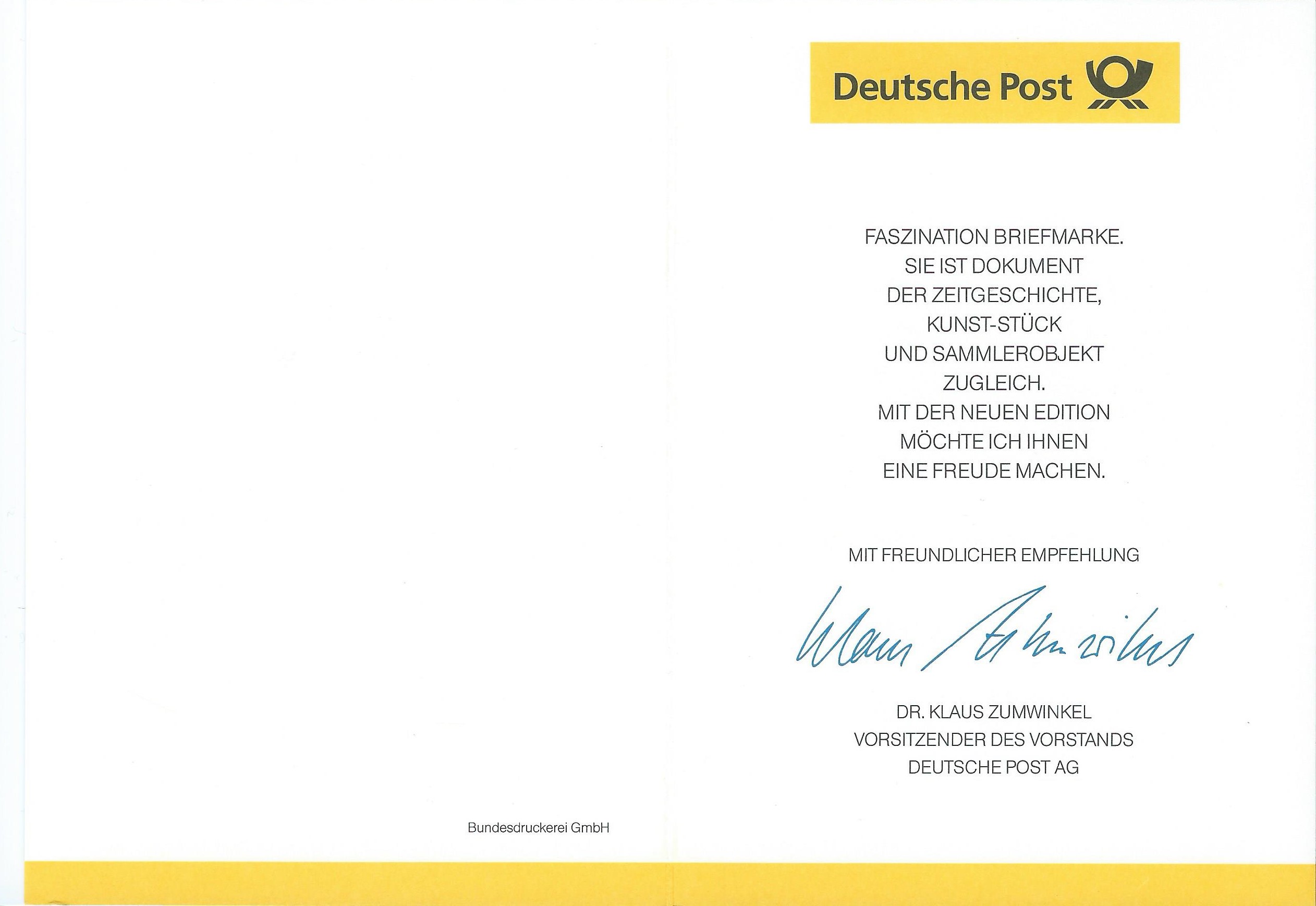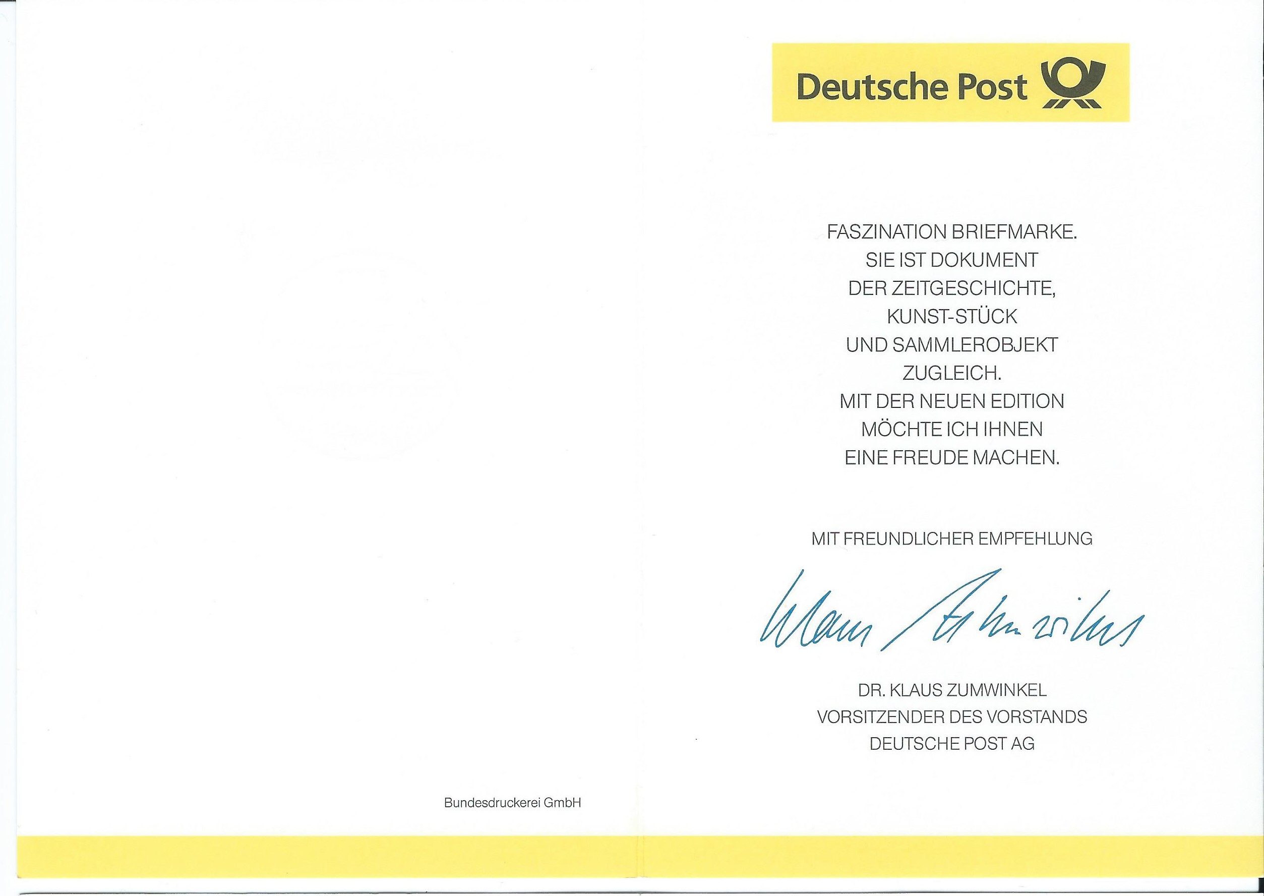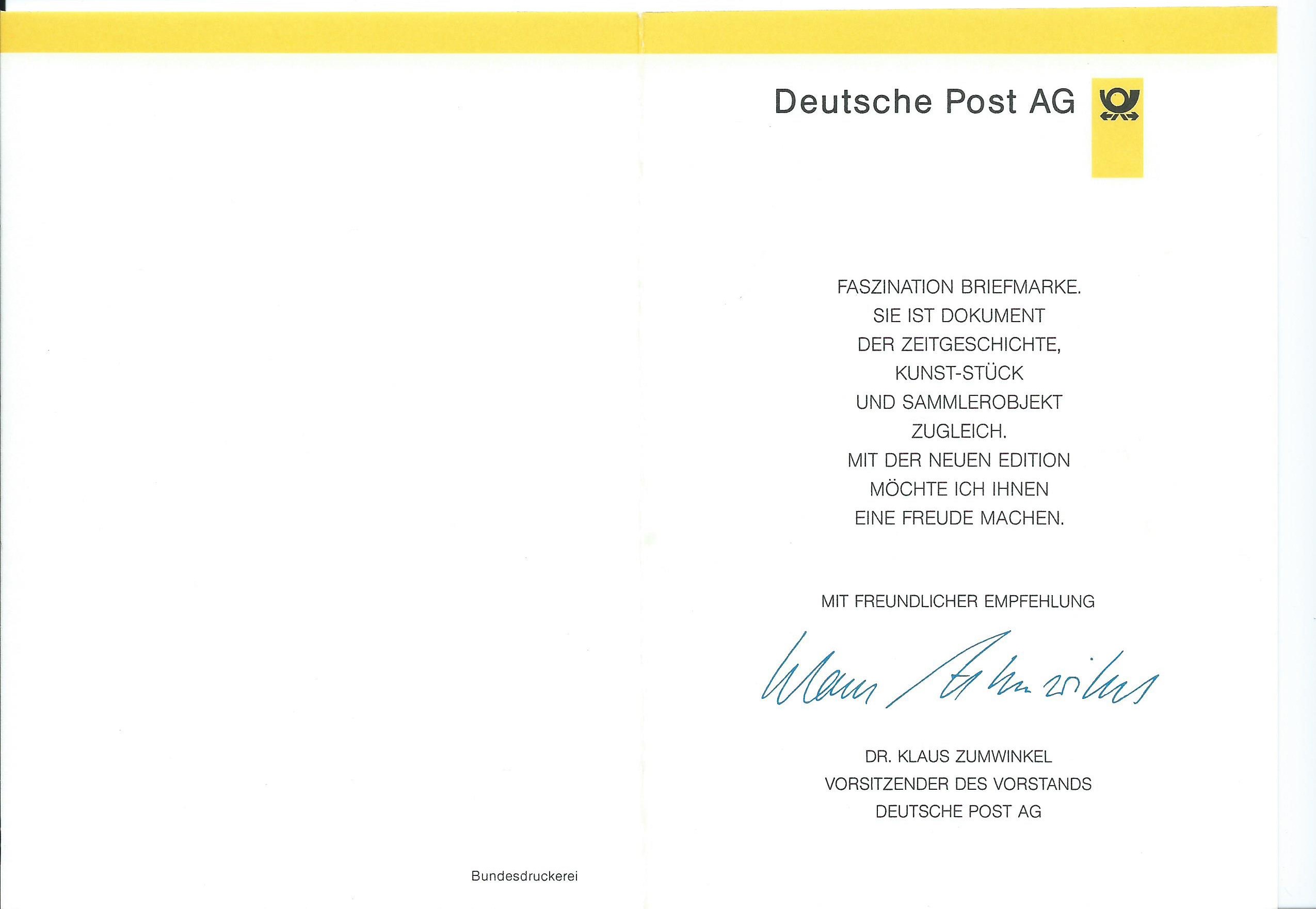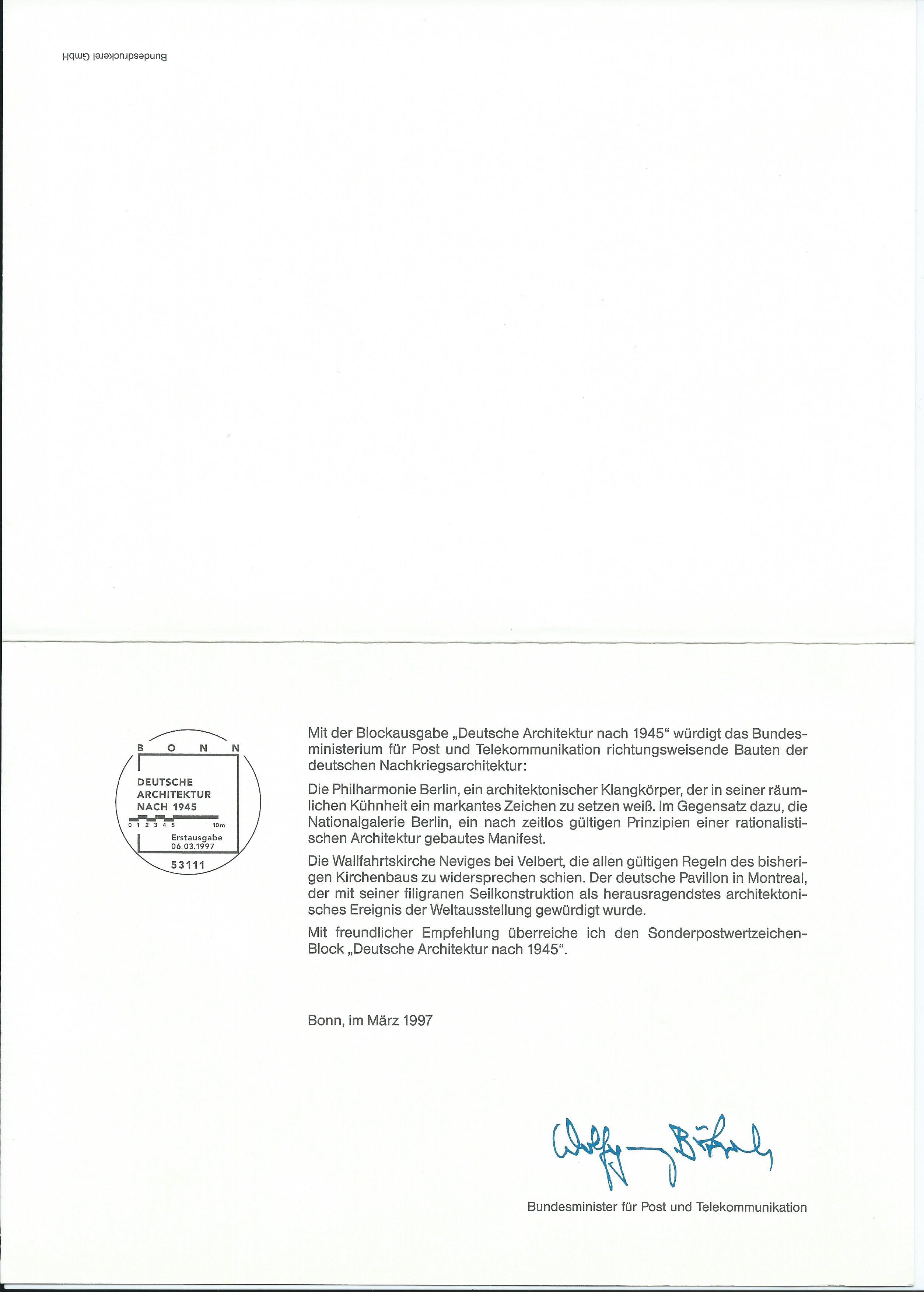 Gefolgt von einer "echten" Ministerkarte mit Unterschrift vom Postminister Bötsch. Ausgabeanlass war für den Block 37 die Deutsche Architektur nach 1945. Aufgeklappt erreicht die Karte fast DIN-A-4-grösse ;)