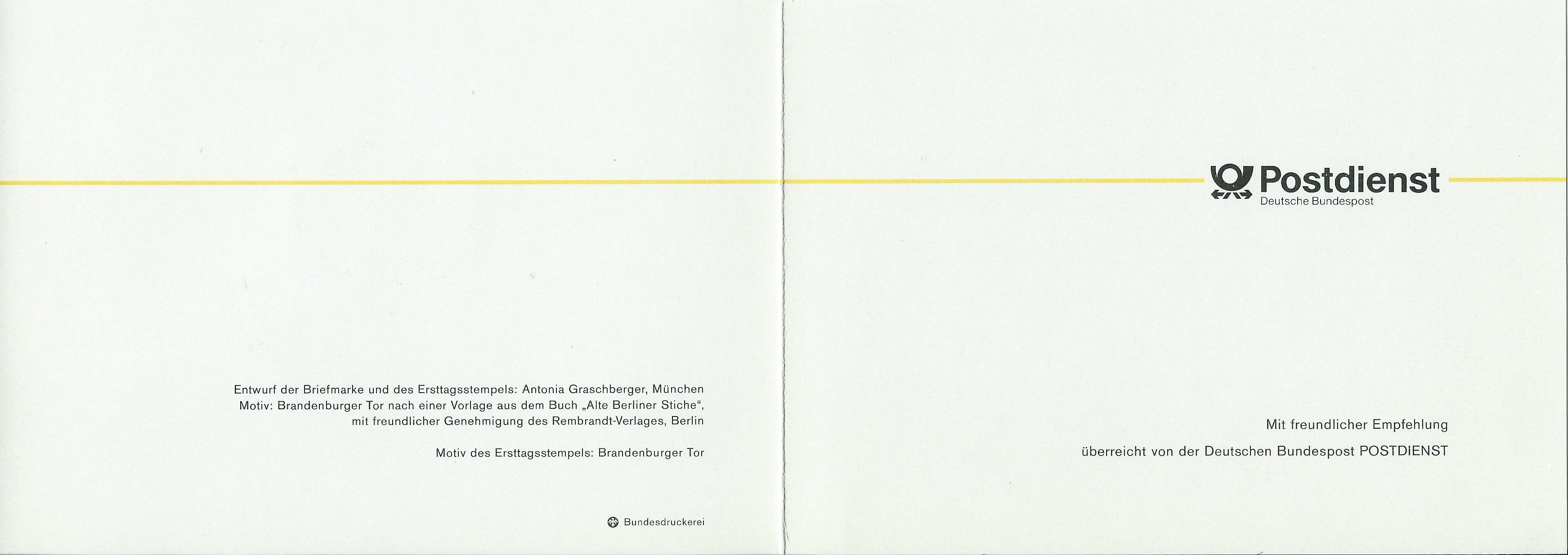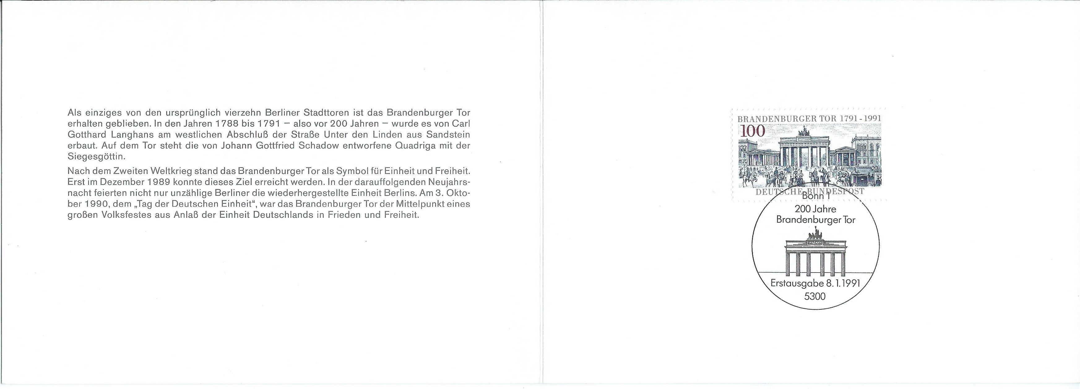 Dann eine Karte vom Postdienst aus 1991: Ausgabeanlass 200 Jahre Brandenburger Tor Berlin auf Mi.Nr. 1492: