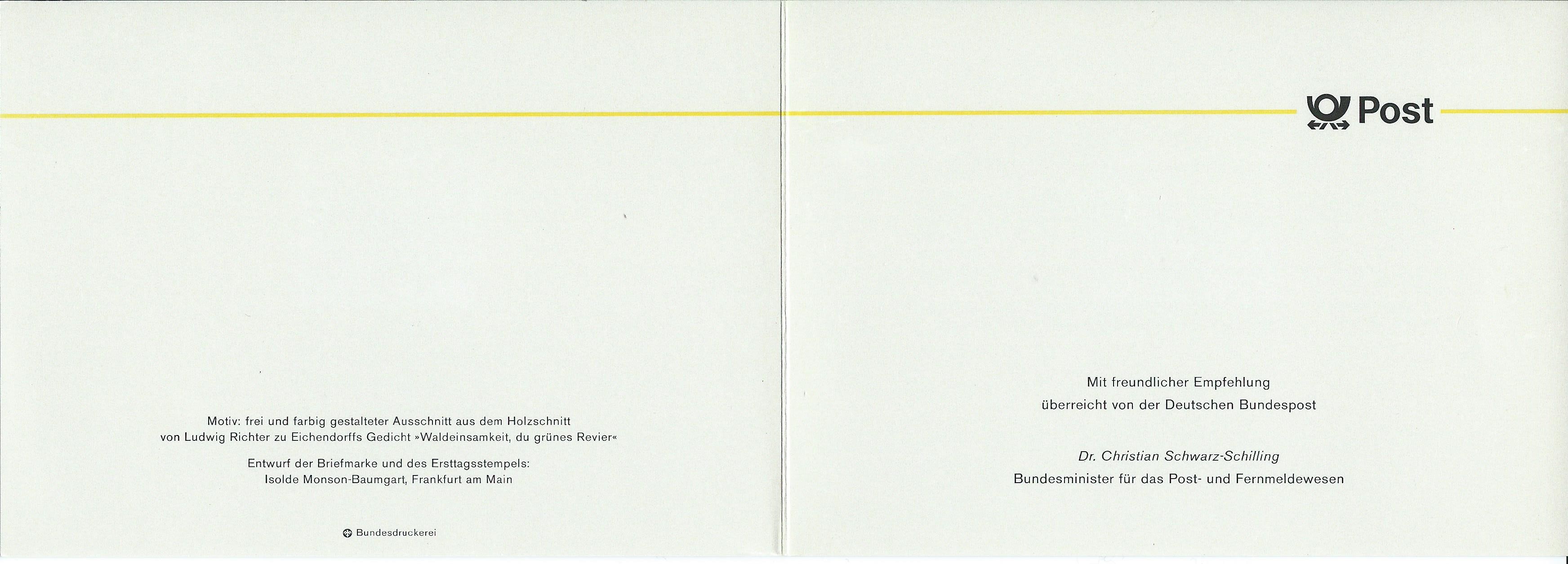 Und als letzte Karte für heute noch eine von Dr. Schwarz Schilling, wieder ohne Unterschrift: Mi.Nr. 1356 zum 200. Geburtstag von Joseph von Eichendorff
