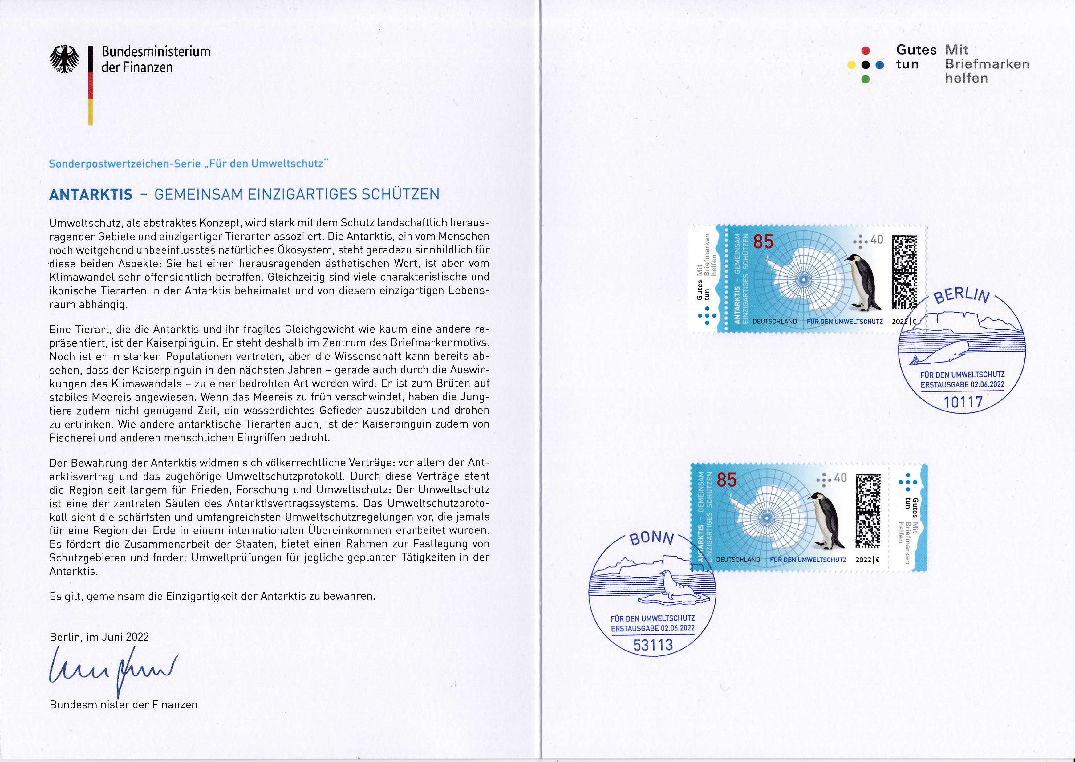 Farbige Ministerkarte des Bundesministers für Finanzen mit zwei Marken zum Thema "Umweltschutz: Antarktis" (MiNr 3689) und den beiden Ersttagsonderstempel Bonn und Berlin.