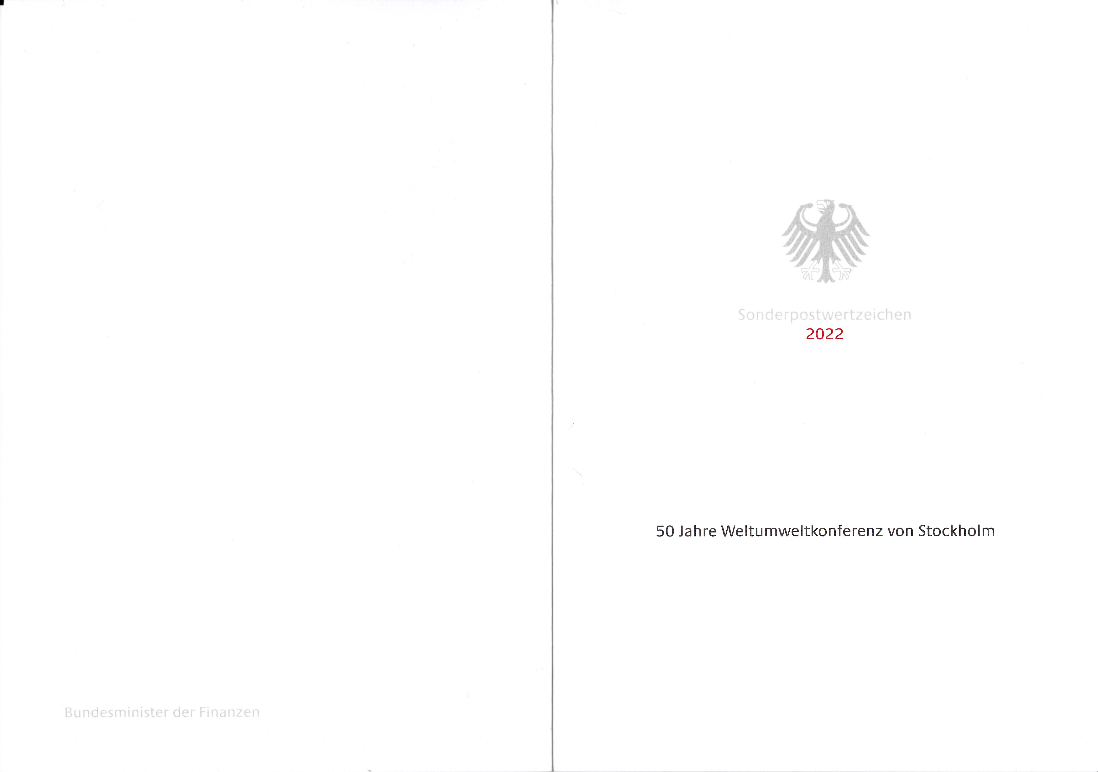 Ministerkarte des Bundesministers für Finanzen mit zwei Marken zum 50. Jahrestag der Weltumweltkonferenz von Stockholm (MiNr 3692) und den beiden Ersttagsonderstempel Bonn und Berlin.