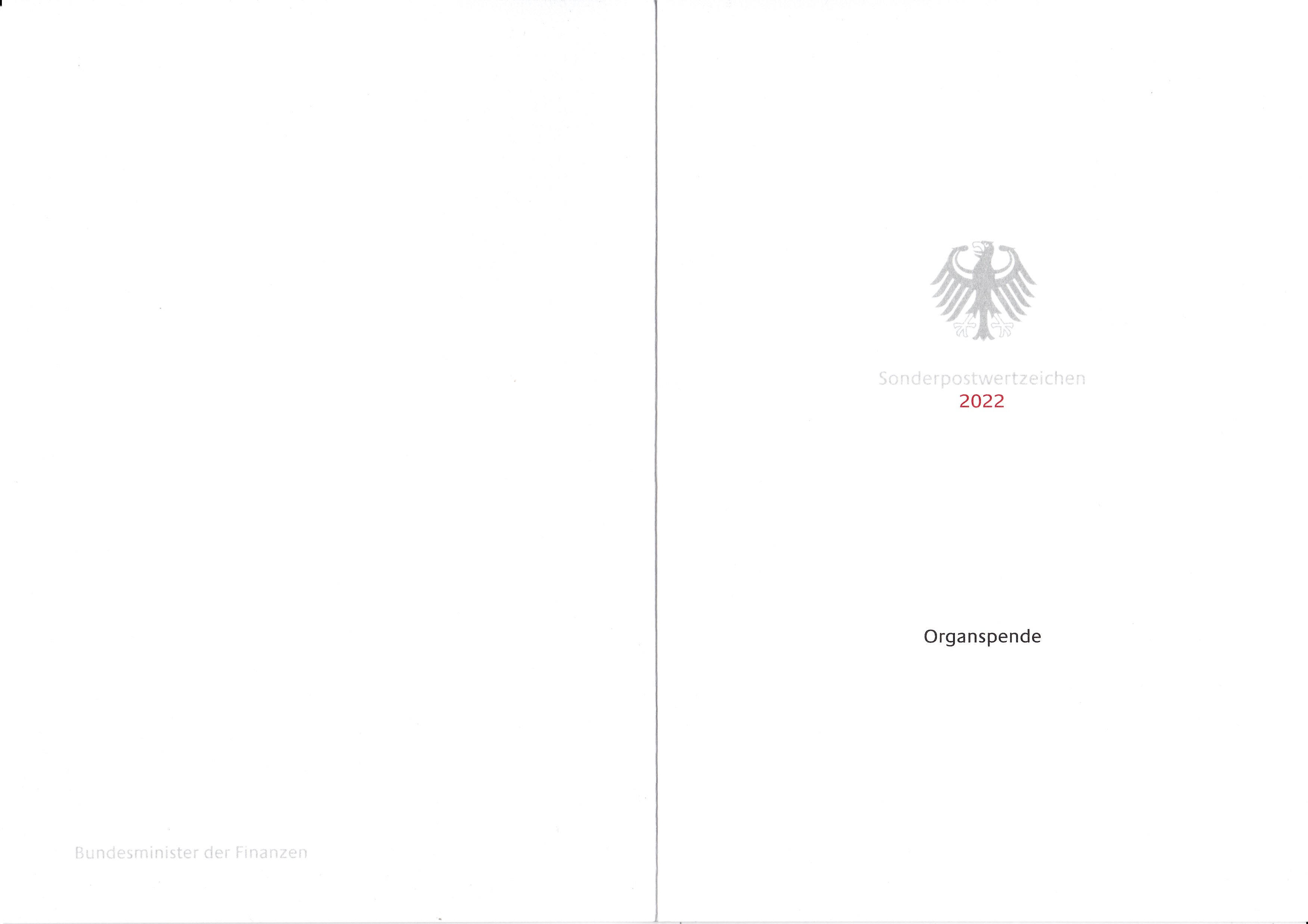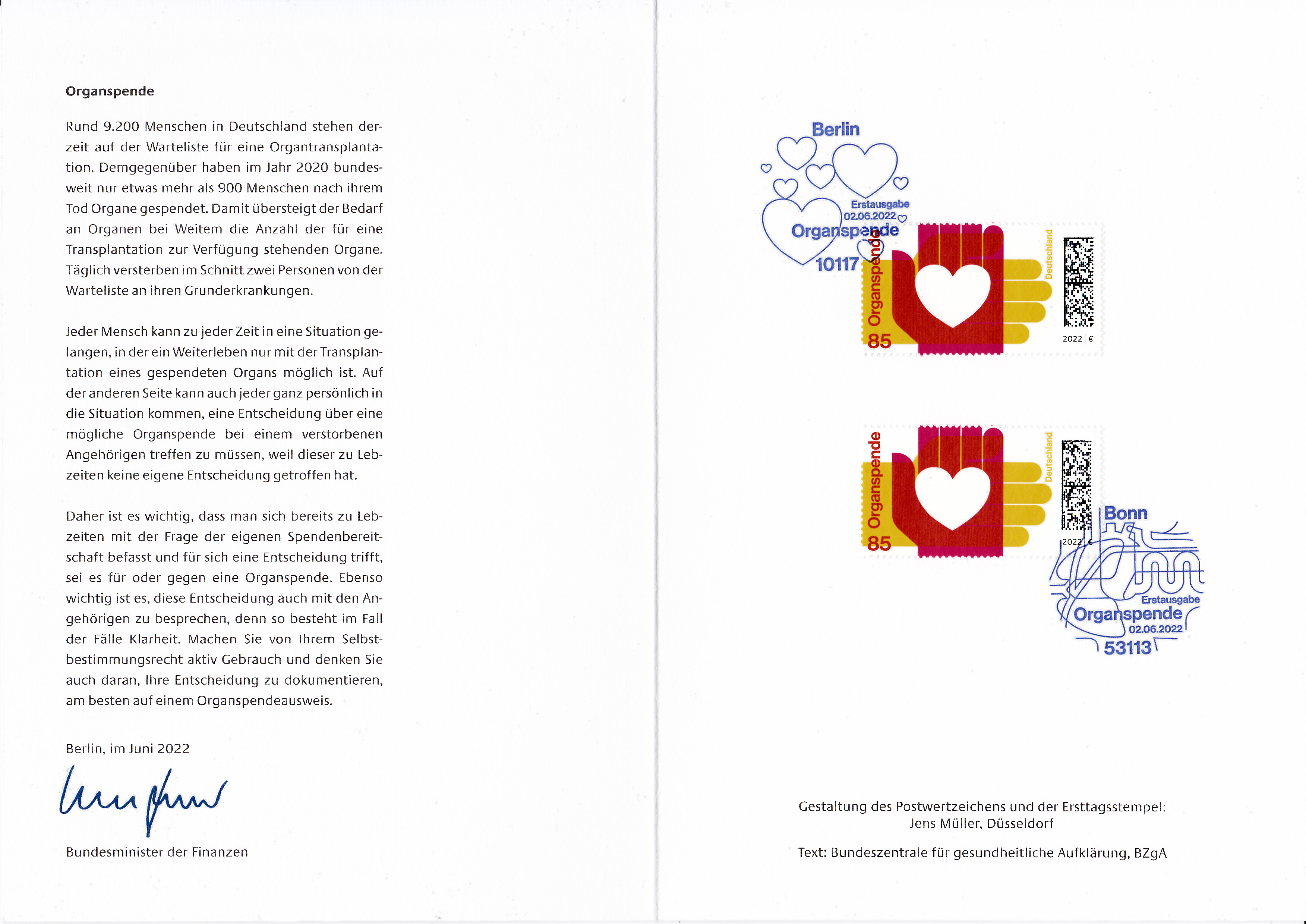 Ministerkarte des Bundesministers für Finanzen mit zwei Marken "Organspende" (MiNr 3693) und den beiden Ersttagsonderstempel Bonn und Berlin.