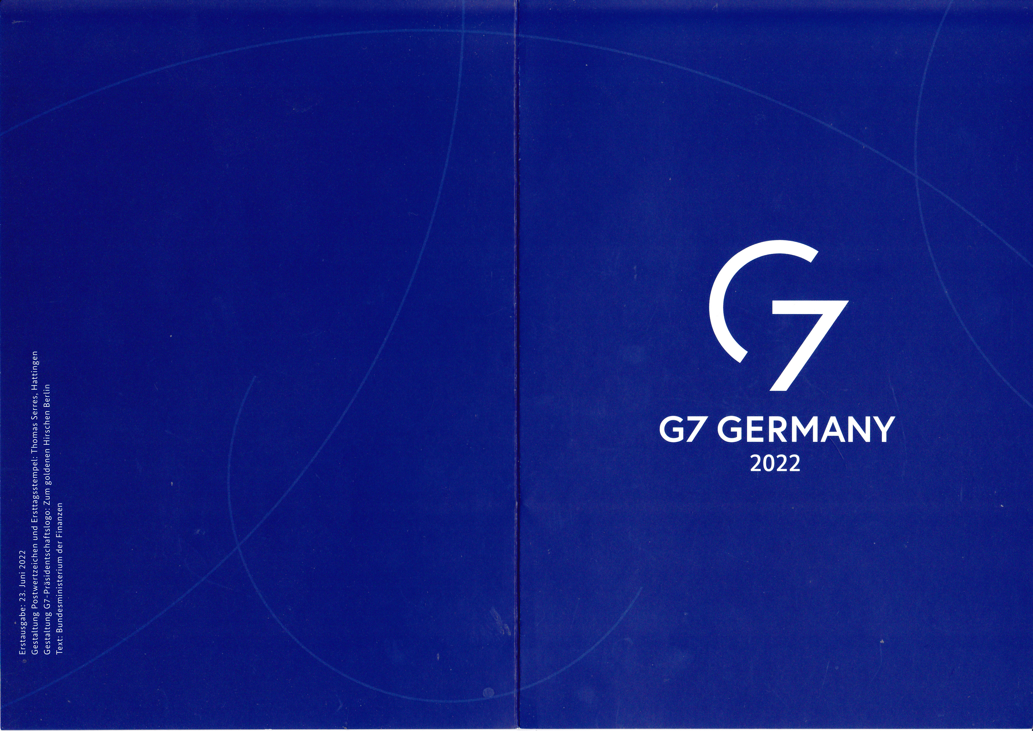 Farbige Ministerkarte des Bundesministers für Finanzen mit zwei Marken "G7-Präsidentschaft Deutschlands 2022" (MiNr 3694) und den beiden Ersttagsonderstempel Bonn und Berlin.