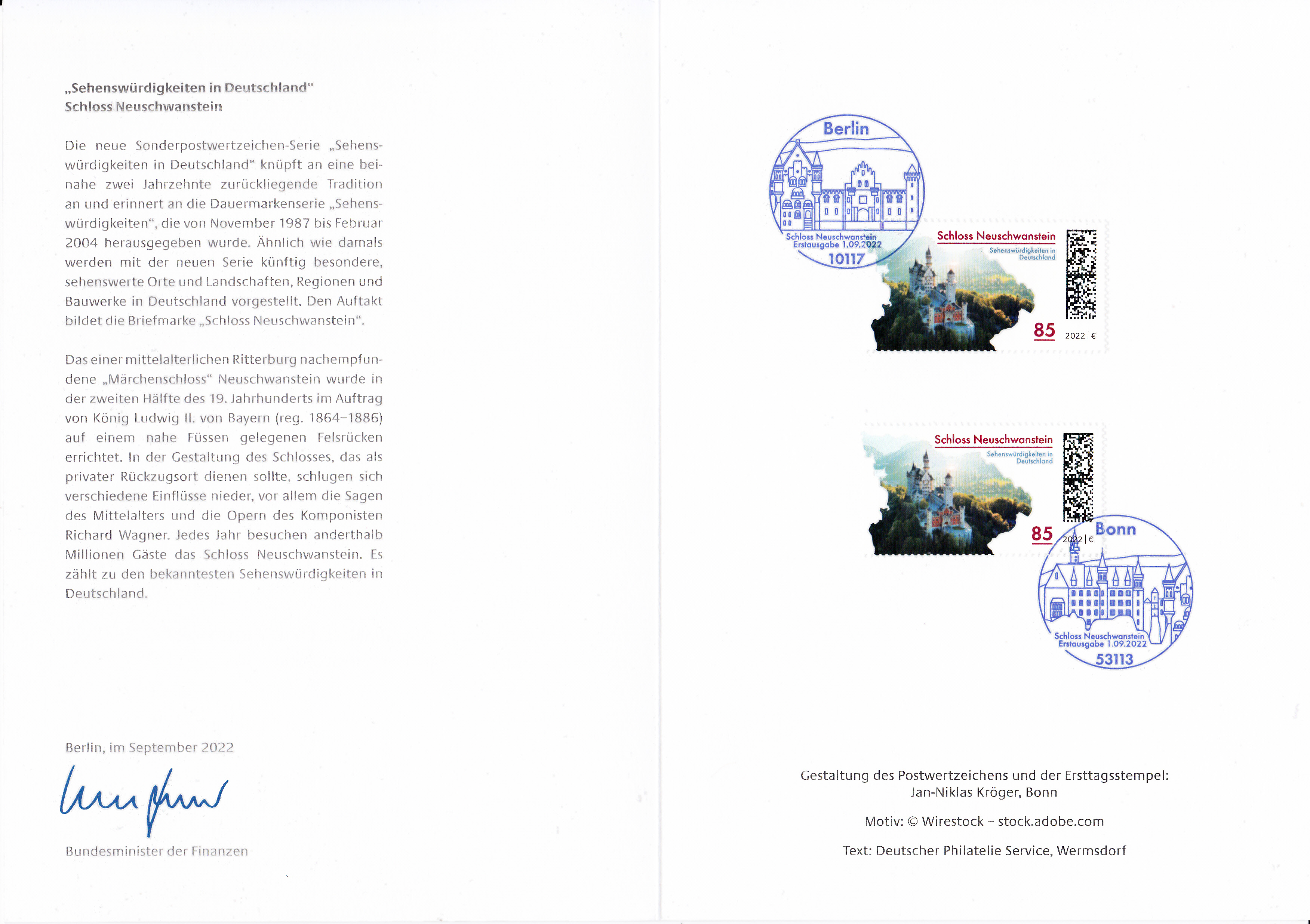 Ministerkarte des Bundesministers für Finanzen mit zwei Marken "Schloss Neuschwanstein" (MiNr 3716) und den beiden Ersttagsonderstempel Bonn und Berlin.