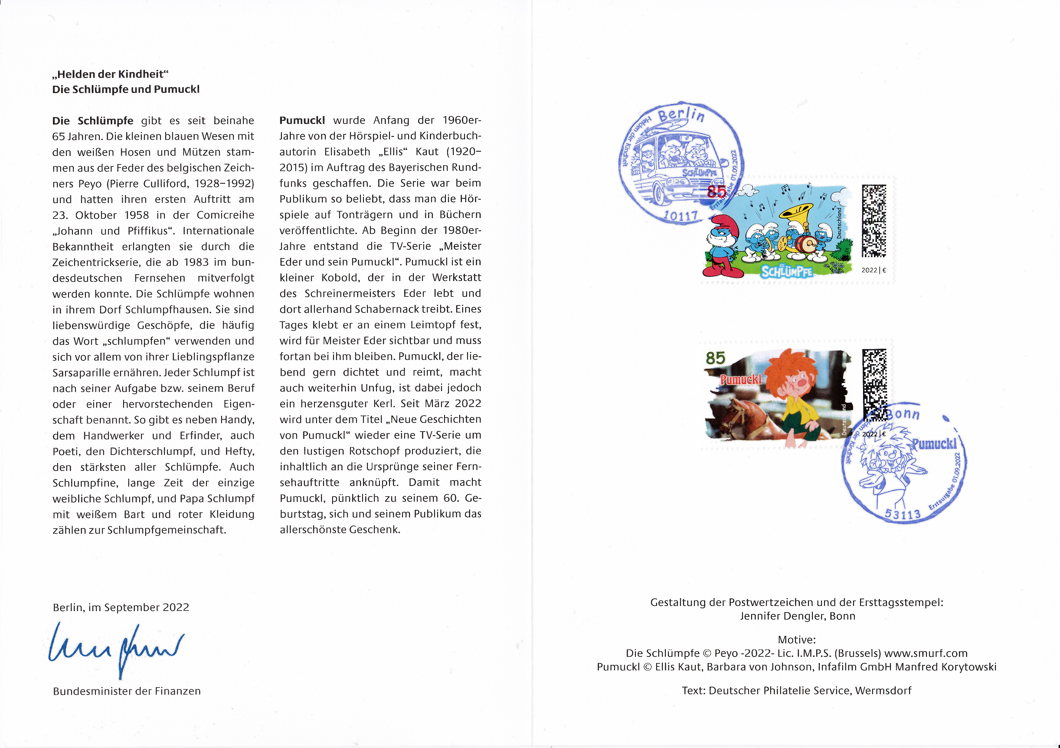 Ministerkarte des Bundesministers für Finanzen mit je einer Marken der Serie "Helden der Kindheit" mit den Motiven "Die Schlümpfe" und "Meister Eder und sein Pumuckl" (MiNr 3717 und 3718) und den beiden Ersttagsonderstempel Bonn und Berlin.