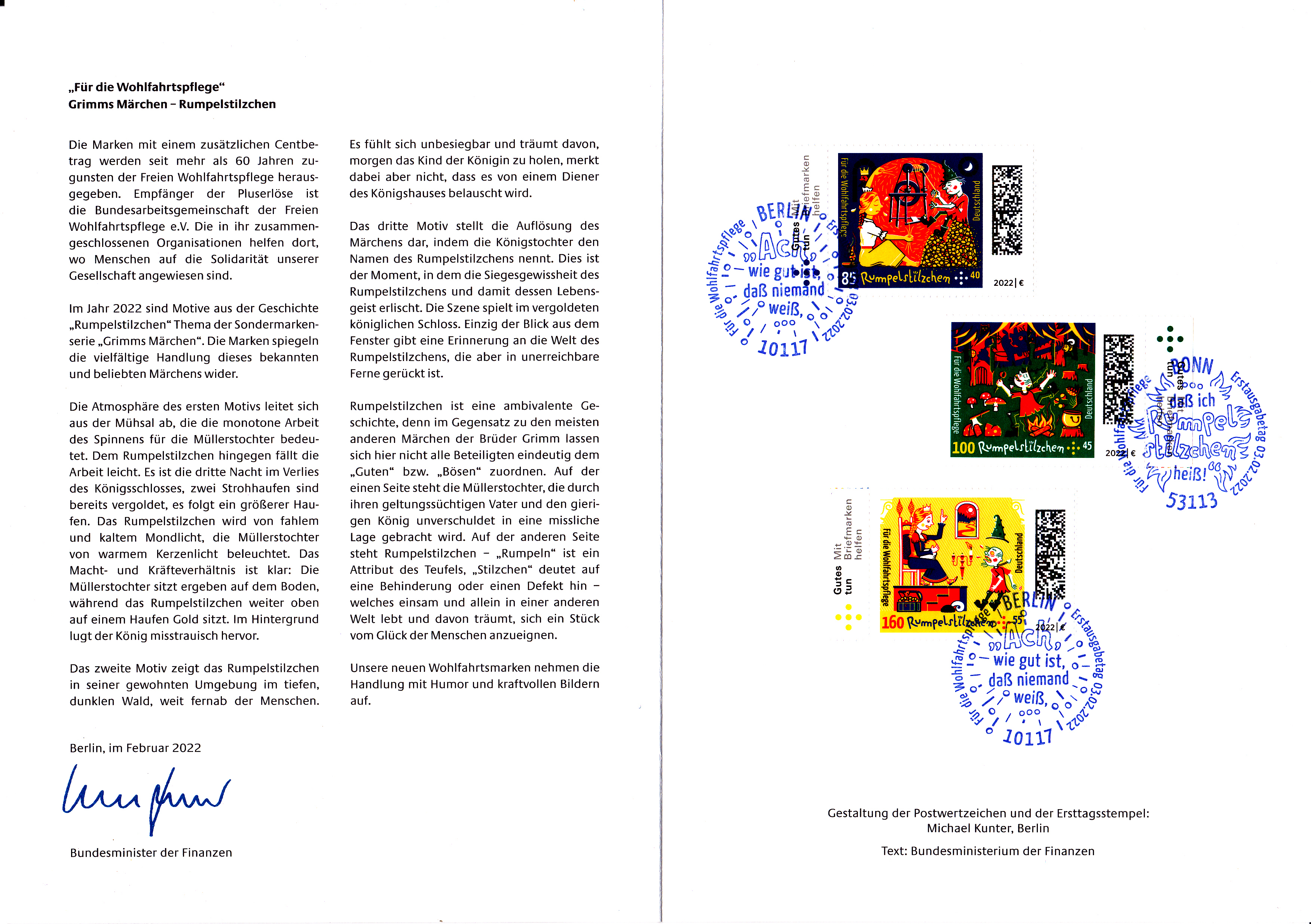 Ministerkarte des Finanzministers mit den drei Wohlfahrtsmarken 2022 (MiNr 3464 bis 3466) mit Motiven zu Grimms Märchen "Rumpelstilzchen" und den beiden Ersttagsonderstempel Bonn und Berlin.