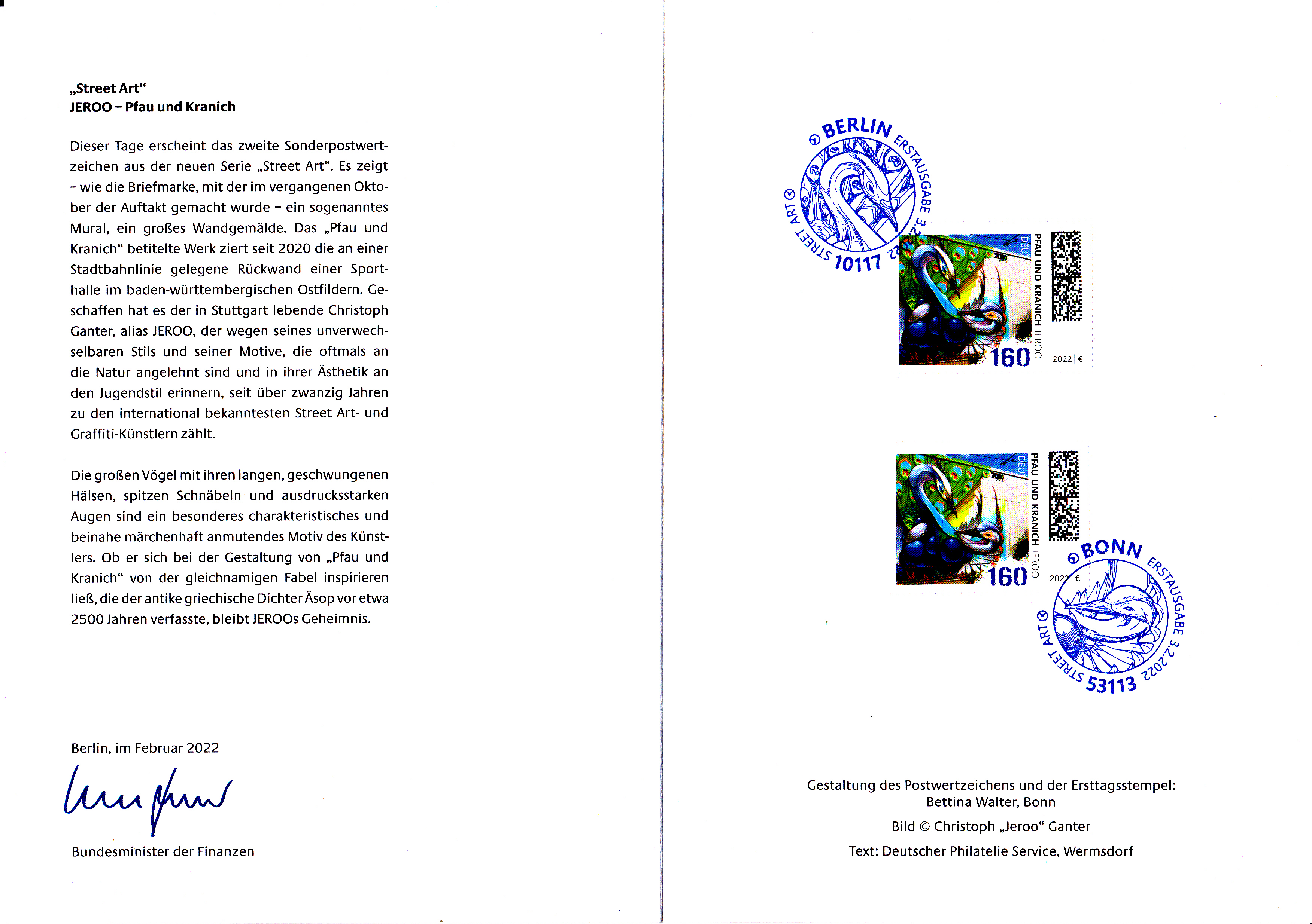 Ministerkarte des Bundesministers für Finanzen mit zwei Marken der Deutschen Post (MiNr 3667) der Serie "Street Art" mit dem Motiv "Wandmalerei „Pfau und Kranich“" von Christoph "Jeroo" Ganter (geb.1980, deutscher Graffiti-Künstler) und den beiden Ersttagsonderstempel Bonn und Berlin.