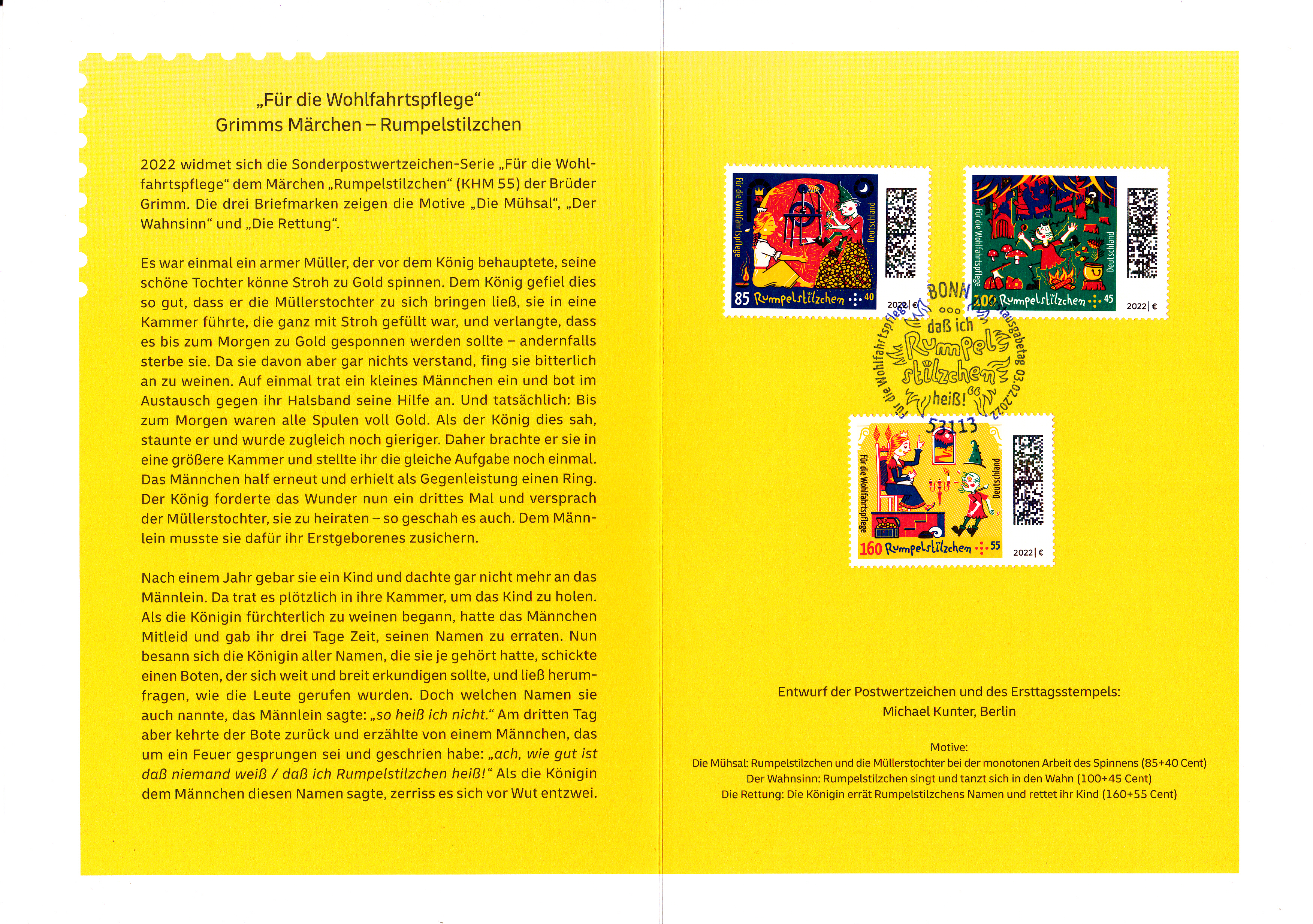 Klappkarte des Vorstandsvorsitzenden der Deutschen Post AG mit den drei Wohlfahrtsmarken 2022 (MiNr 3464 bis 3466) mit Motiven zu Grimms Märchen "Rumpelstilzchen" und und dem Ersttagsonderstempel Bonn.