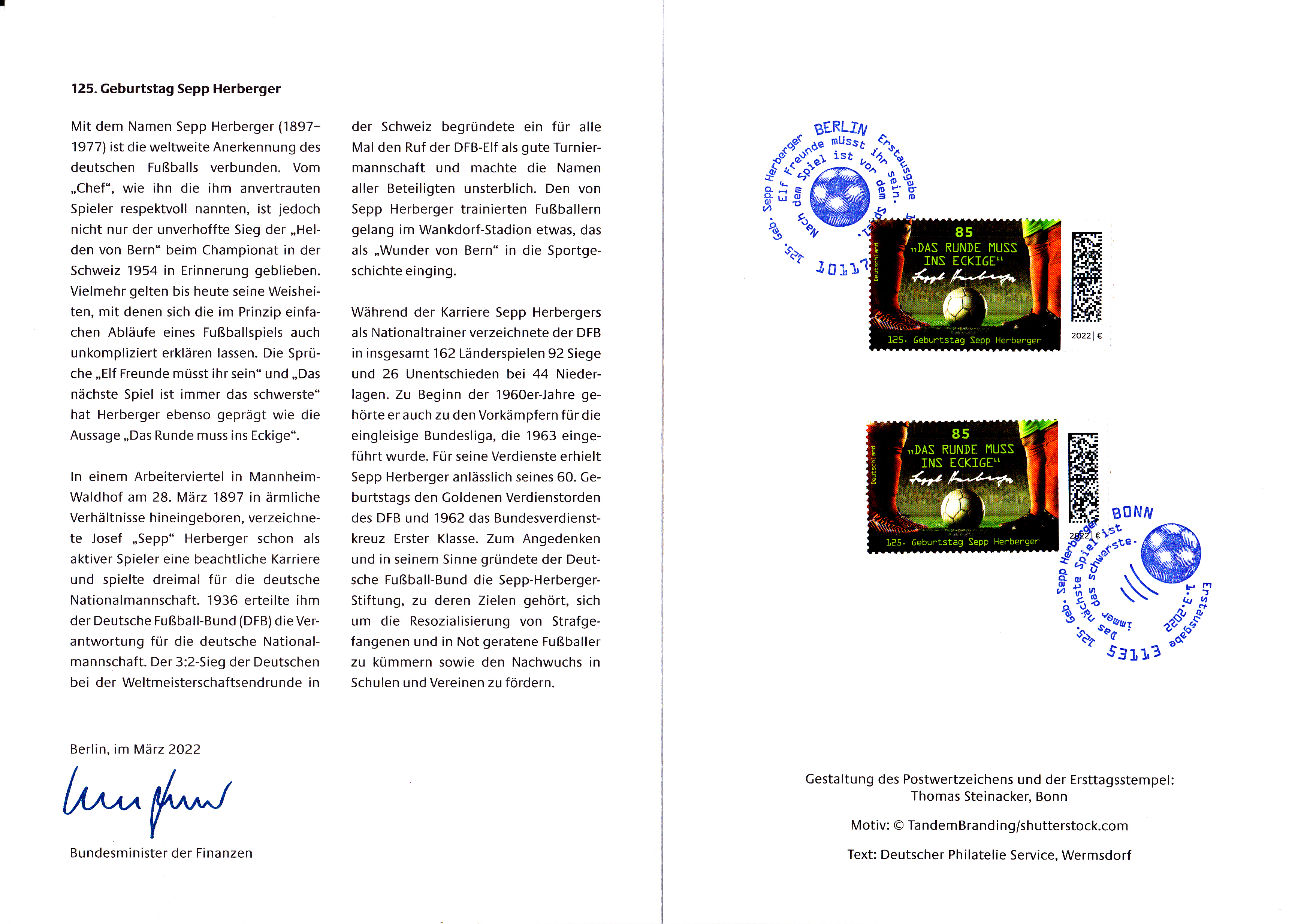 Ministerkarte des Finanzministers mit zwei Marken zum 125. Geburtstag von Josef Herberger (MiNr 3675) und den beiden Ersttagsonderstempel Bonn und Berlin.