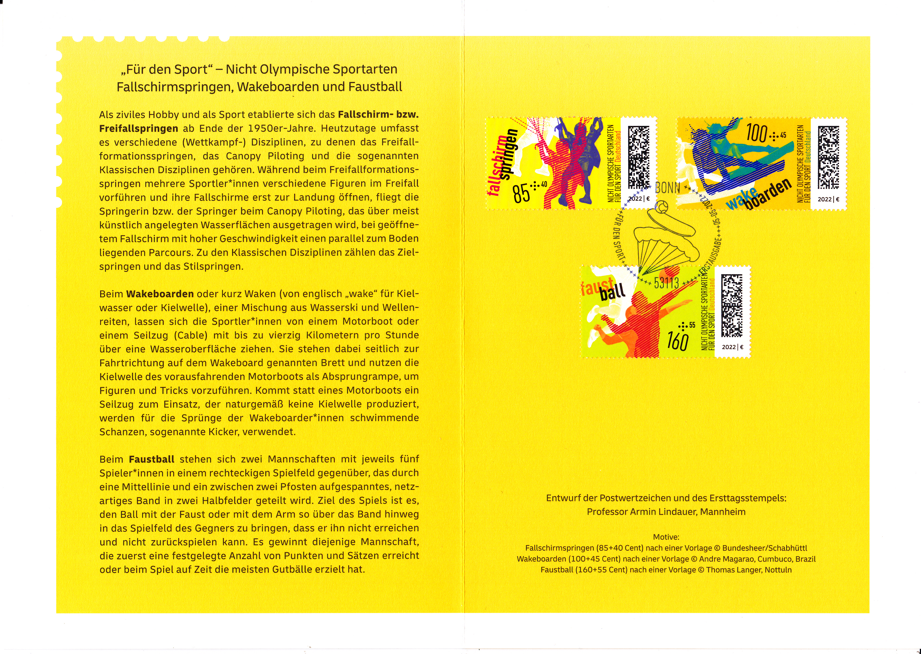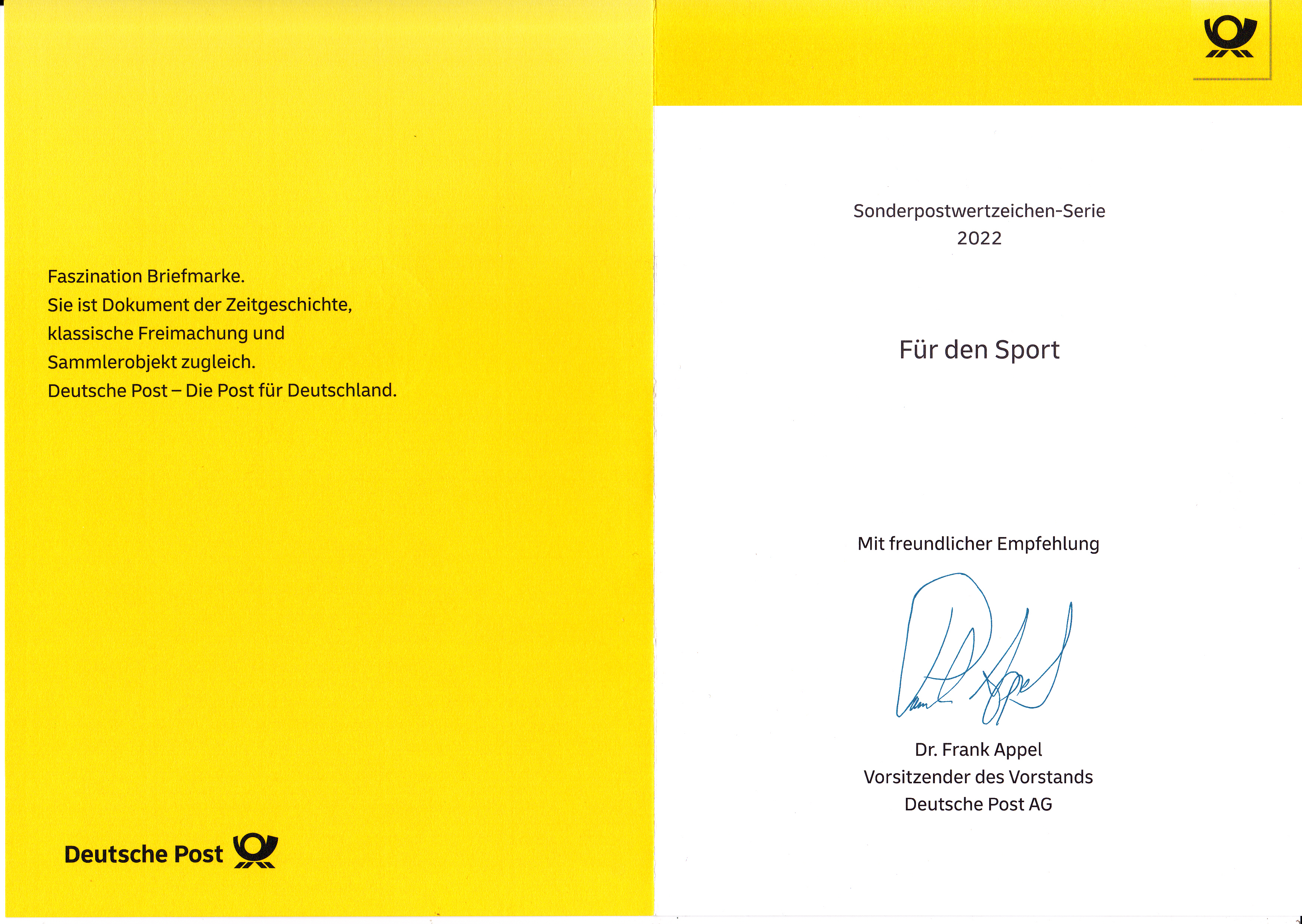 Klappkarte des Vorstandsvorsitzenden der Deutschen Post AG je einer Marke der Sporthilfemarken 2022 (MiNr 3684/3686) mit Motiven zu "Nicht olympische Sportarten" und dem Ersttagsonderstempel Bonn.