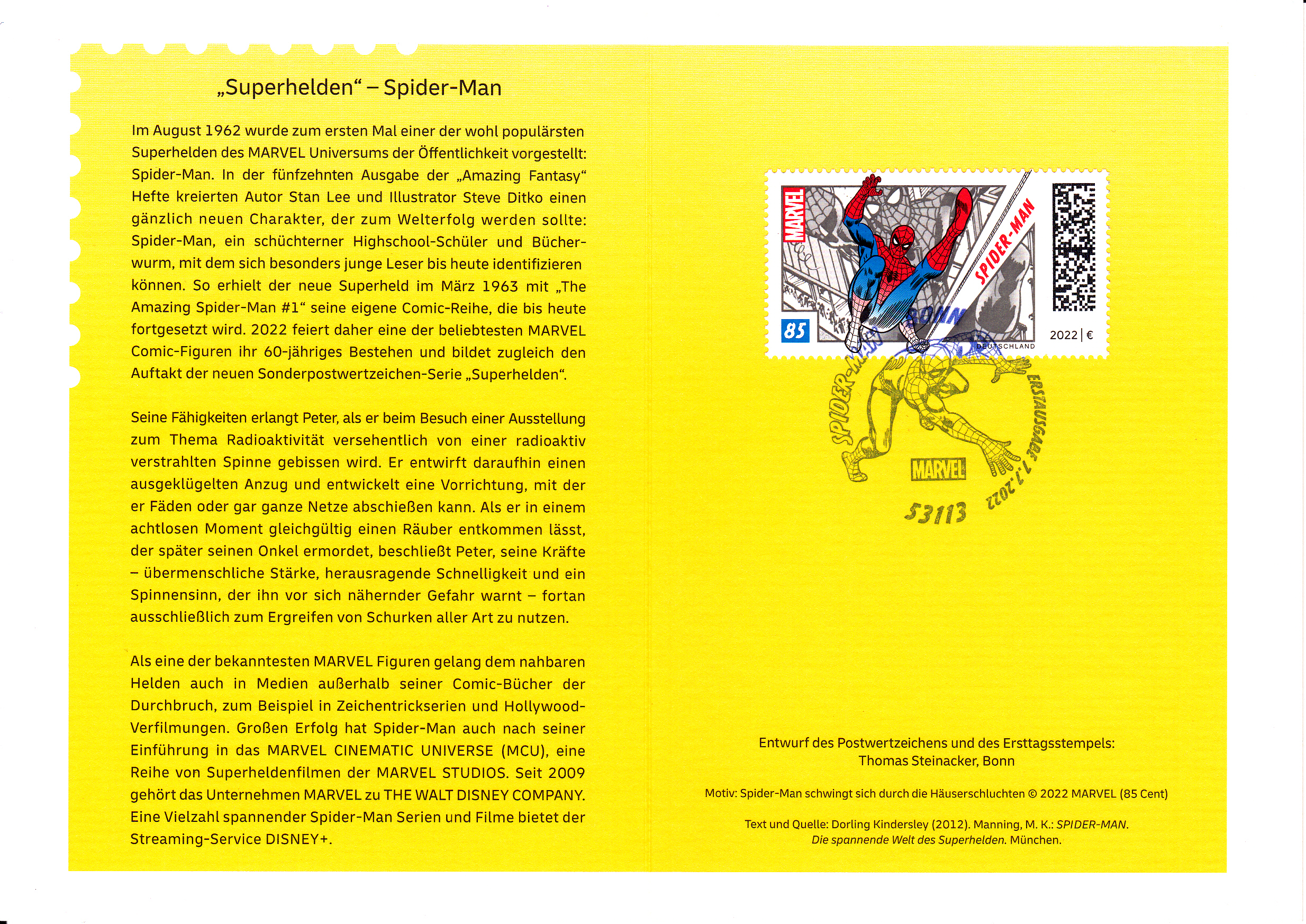 Klappkarte des Vorstandsvorsitzenden der Deutschen Post AG mit der Marke der Deutschen Post (MiNr 3697) aus der Serie "Superhelden" mit dem Motiv "Spider-Man" und dem Ersttagsonderstempel Bonn.