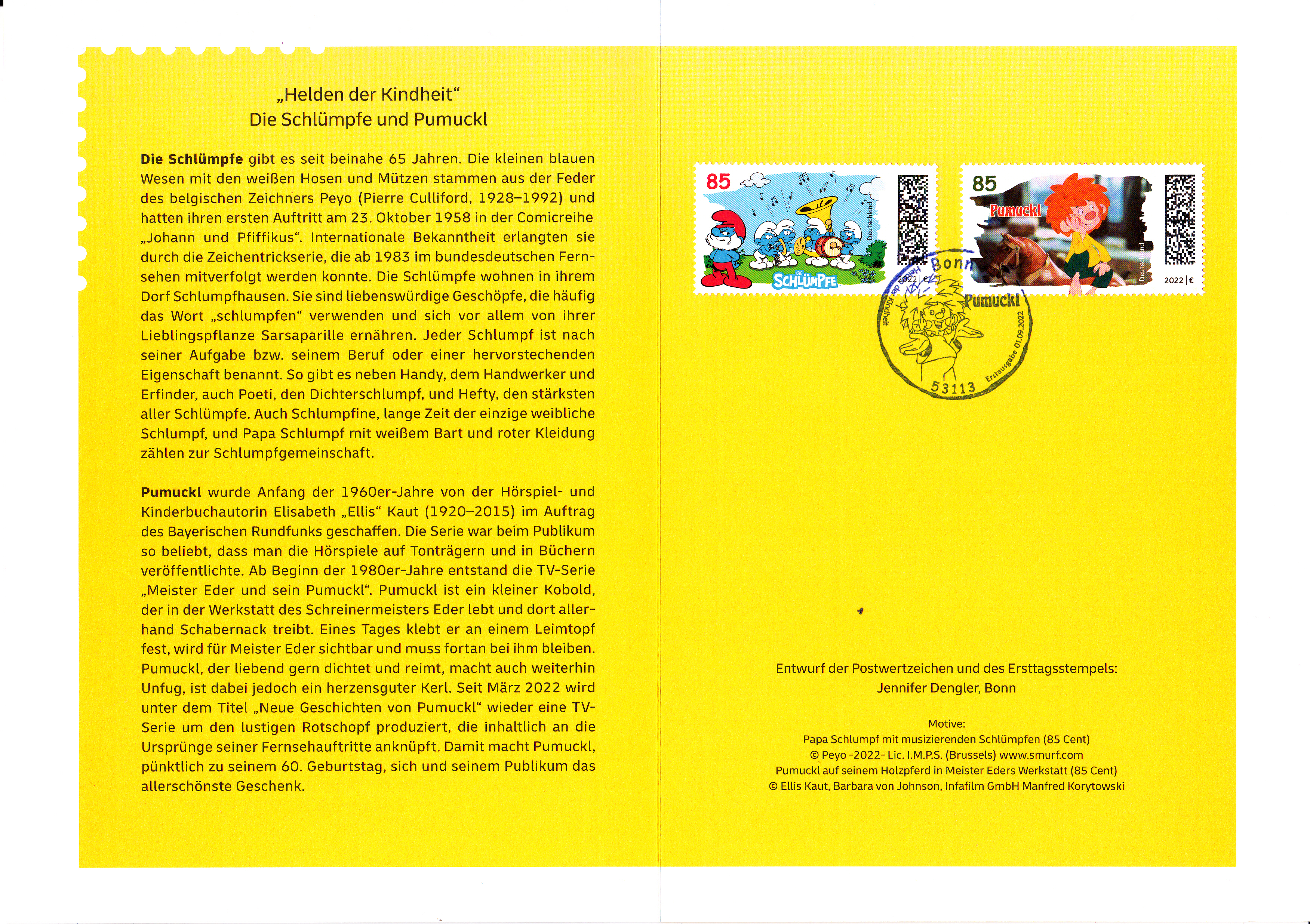 Klappkarte des Vorstandsvorsitzenden der Deutschen Post AG mit je einer Marken der Serie "Helden der Kindheit" mit den Motiven "Die Schlümpfe" und "Meister Eder und sein Pumuckl" (MiNr 3717 und 3718) und dem Ersttagsonderstempel Bonn.