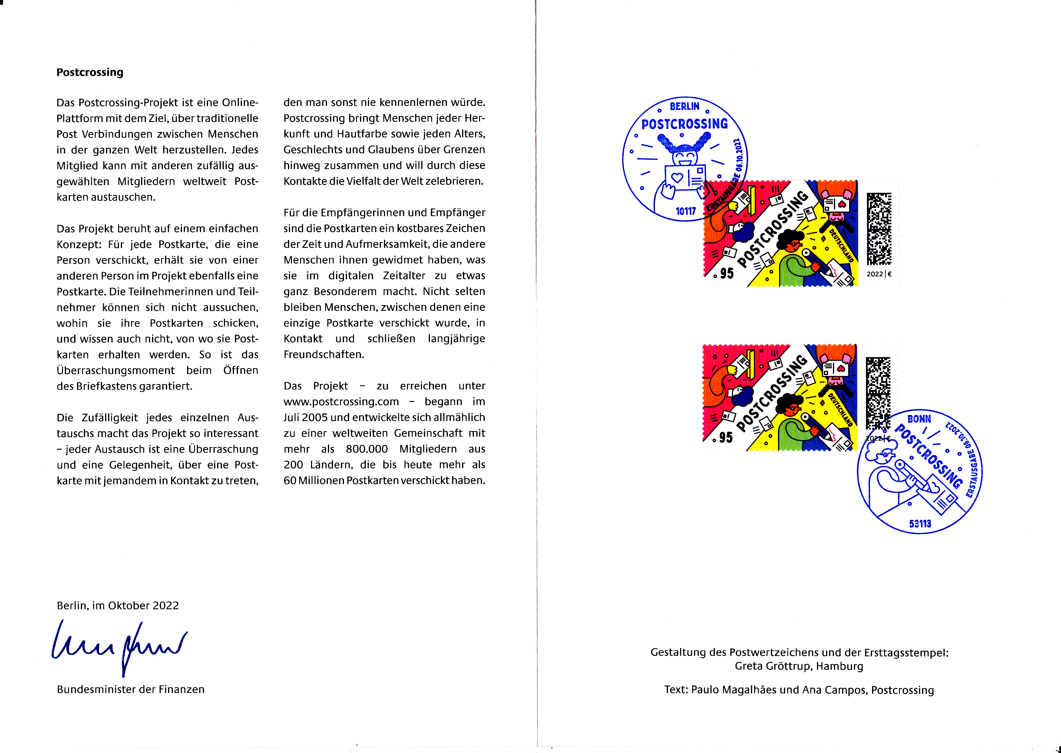 Ministerkarte des Bundesministers für Finanzen mit zwei Marken (MiNr 3722) zum Thema "Postcrossing" und den beiden Ersttagsonderstempel Bonn und Berlin.
