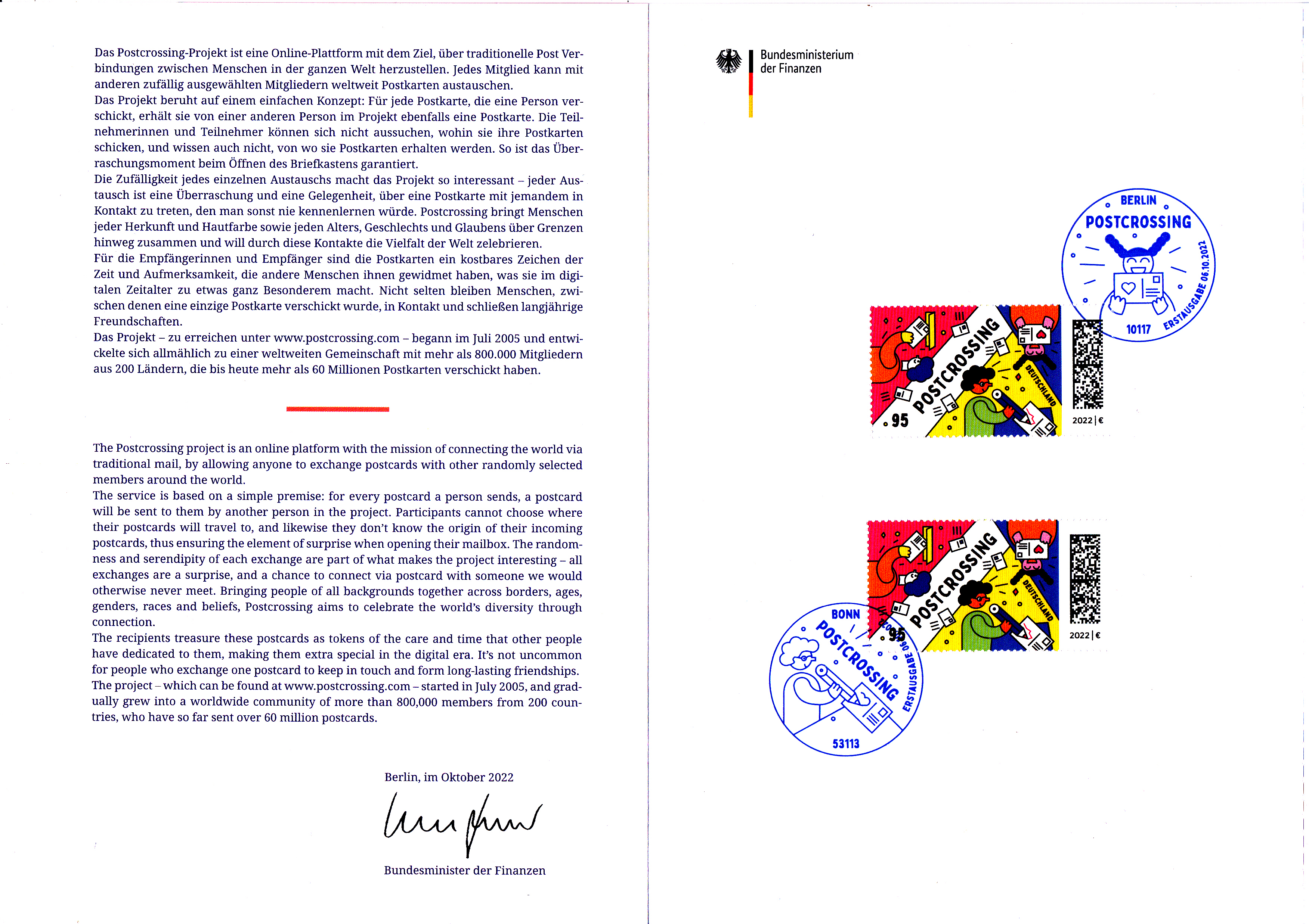 Farbige Ministerkarte des Bundesministers für Finanzen mit zwei Marken (MiNr 3722) zum Thema "Postcrossing" und den beiden Ersttagsonderstempel Bonn und Berlin.