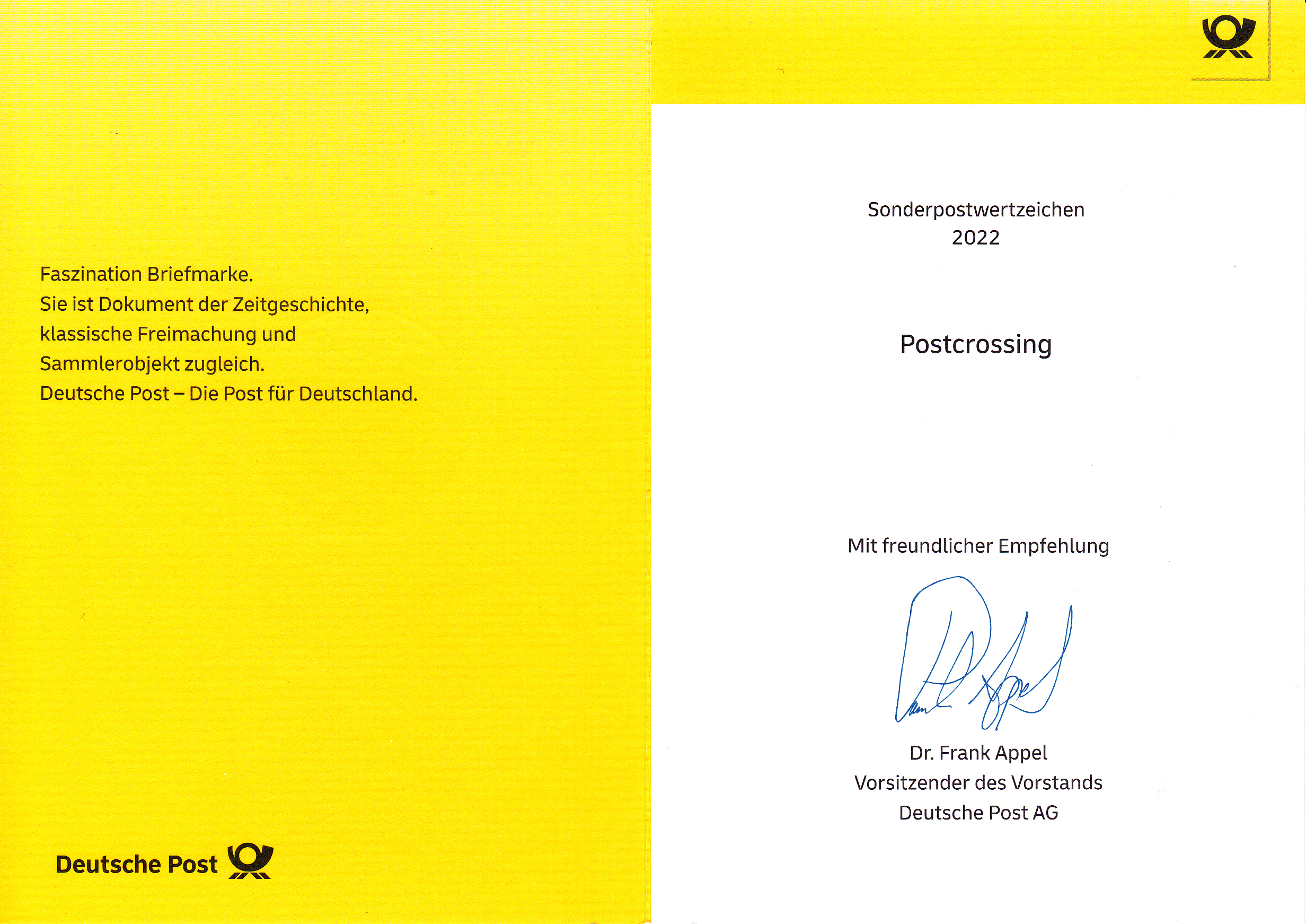 Klappkarte des Vorstandsvorsitzenden der Deutschen Post AG mit einer Marke (MiNr 3722) zum Thema "Postcrossing" und dem Ersttagsonderstempel Bonn.