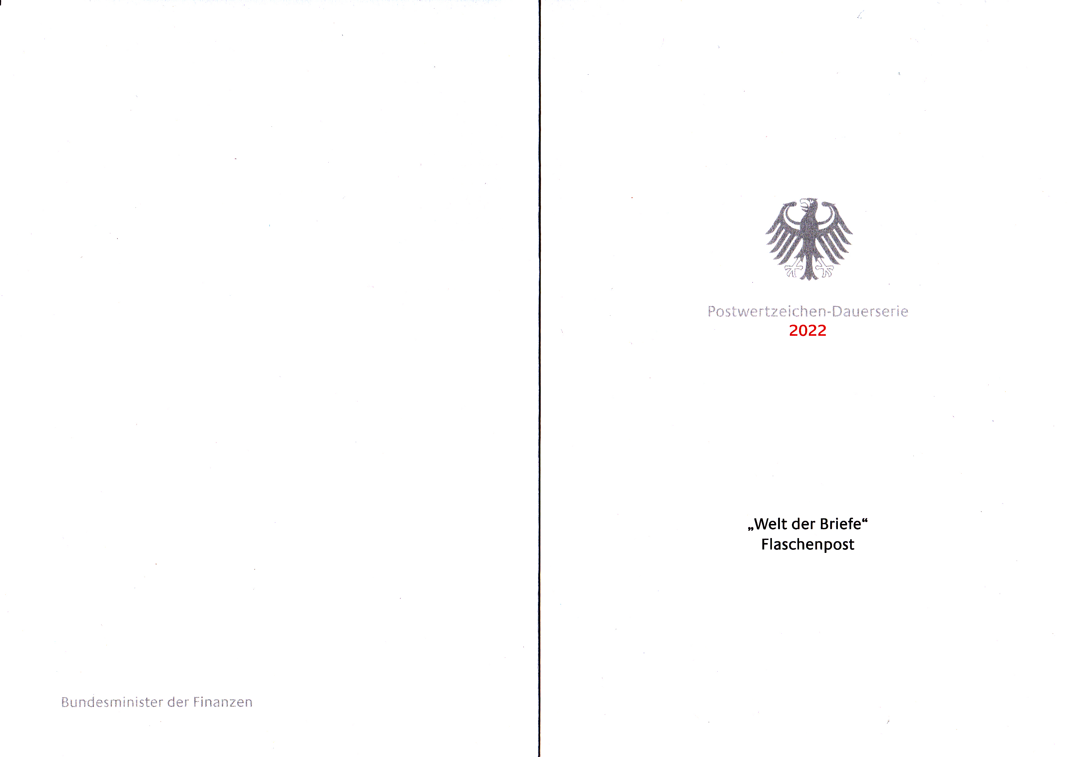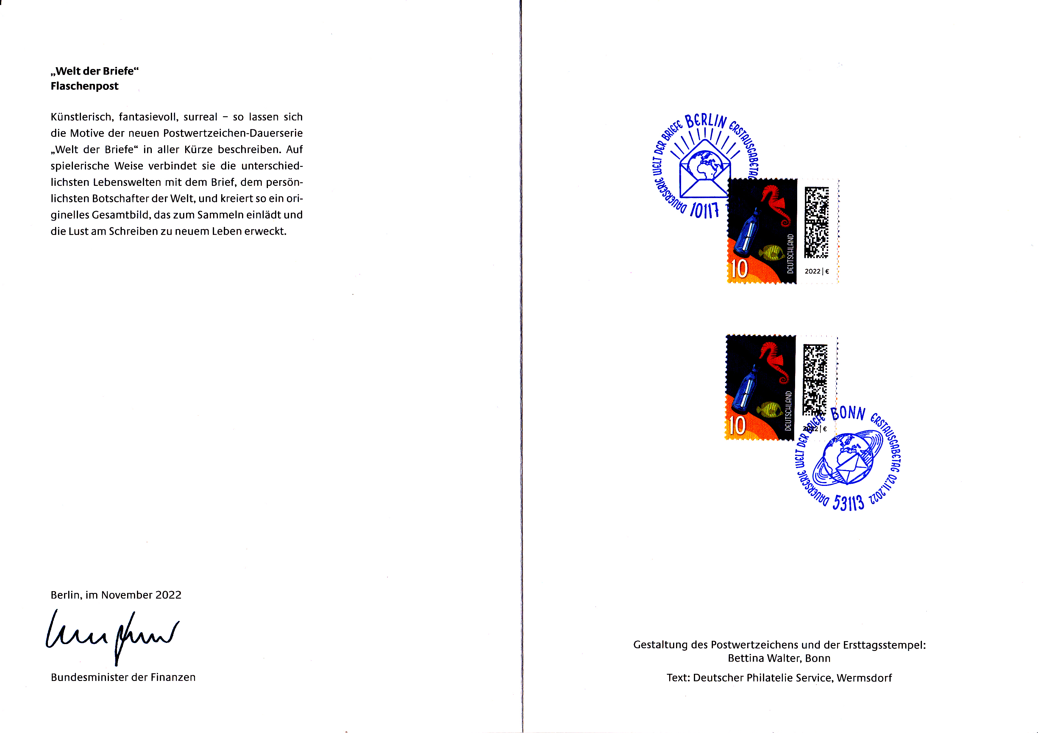 Ministerkarte des Bundesministers für Finanzen mit den zwei Marken zu 10 Cent der Freimarkenserie "Welt der Briefe" (MiNr 3723) mit dem Motiv "Flaschenpost mit Rotem Seepferdchen (Hippocampus kuda) und Gelbem Segeldoktorfisch (Zebrasoma flavescens)" und den beiden Ersttagsonderstempel Bonn und Berlin.