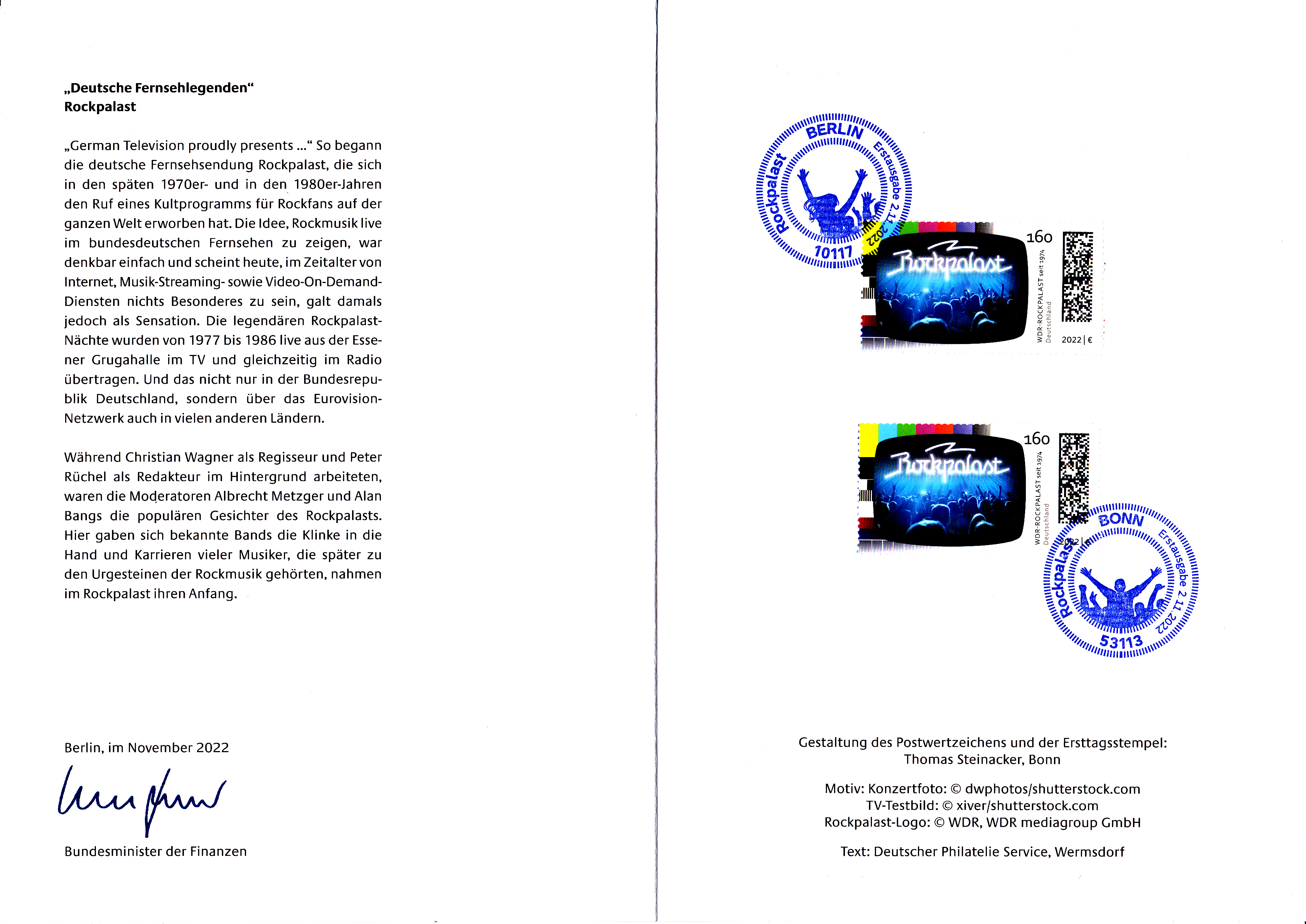 Ministerkarte des Bundesministers für Finanzen mit zwei Marken (MiNr 3725) aus der Serie "Deutsche Fernsehlegende" mit dem Motiv "Fernsehbild mit Zuschauern eines Rockpalast-Konzerts" und den beiden Ersttagsonderstempel Bonn und Berlin.