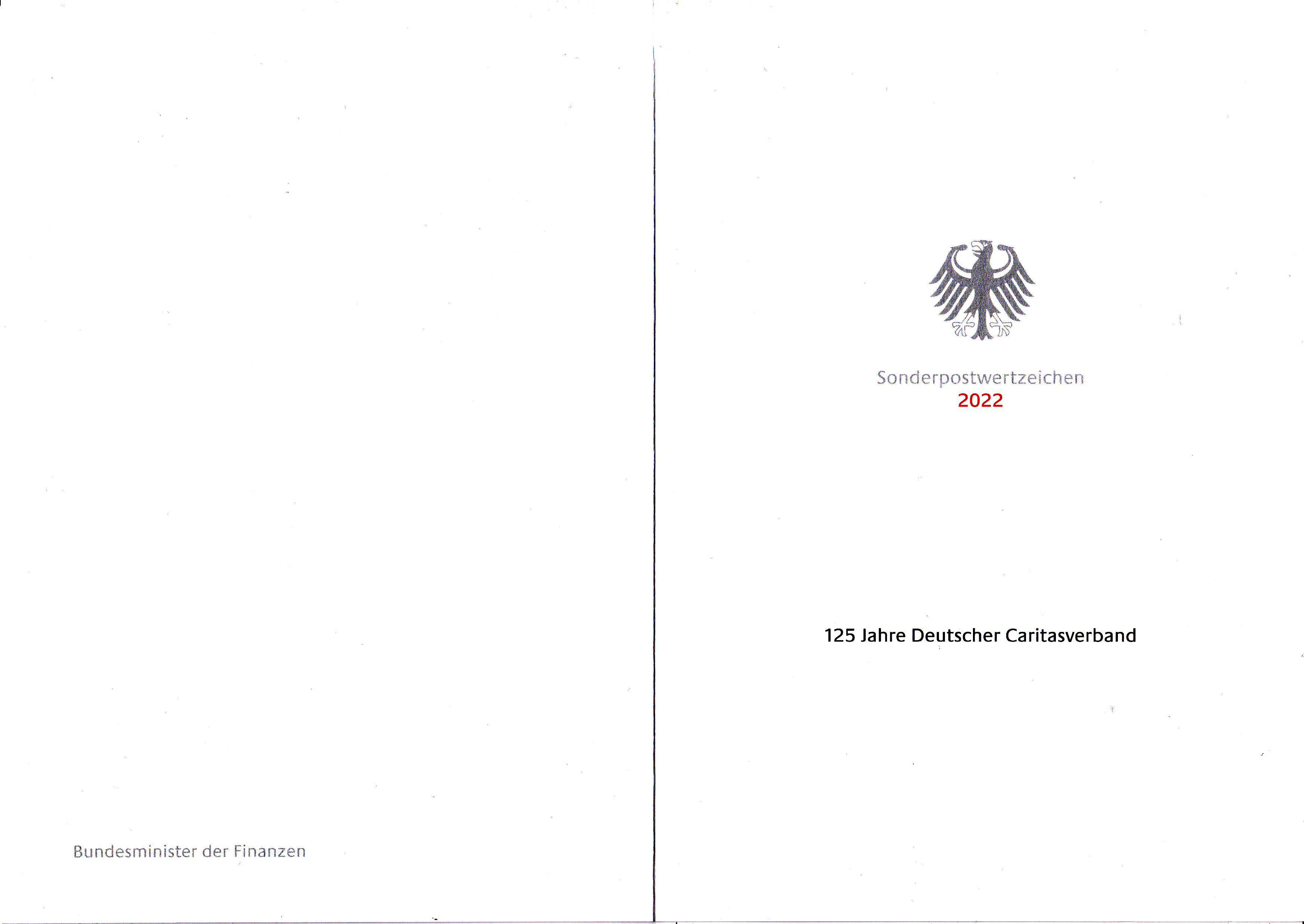 Ministerkarte des Bundesministers für Finanzen mit zwei Marken (MiNr 3726) "125 Jahre Deutscher Caritasverband" und den beiden Ersttagsonderstempel Bonn und Berlin.