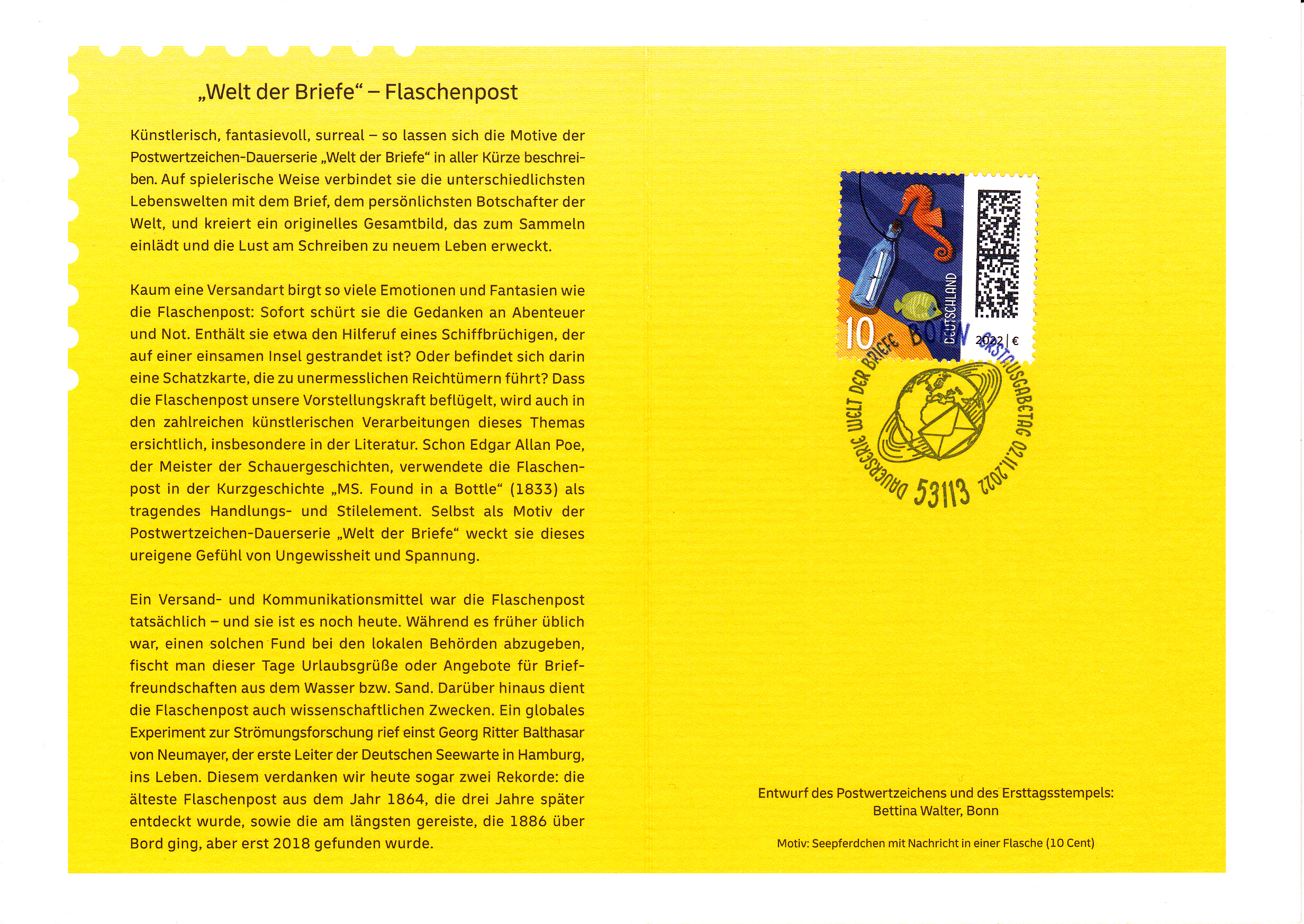Klappkarte des Vorstandsvorsitzenden der Deutschen Post AG mit einer Marke zu 10 Cent der Freimarkenserie "Welt der Briefe" (MiNr 3723) mit dem Motiv "Flaschenpost mit Rotem Seepferdchen (Hippocampus kuda) und Gelbem Segeldoktorfisch (Zebrasoma flavescens)" und den beiden Ersttagsonderstempel Bonn und Berlin.