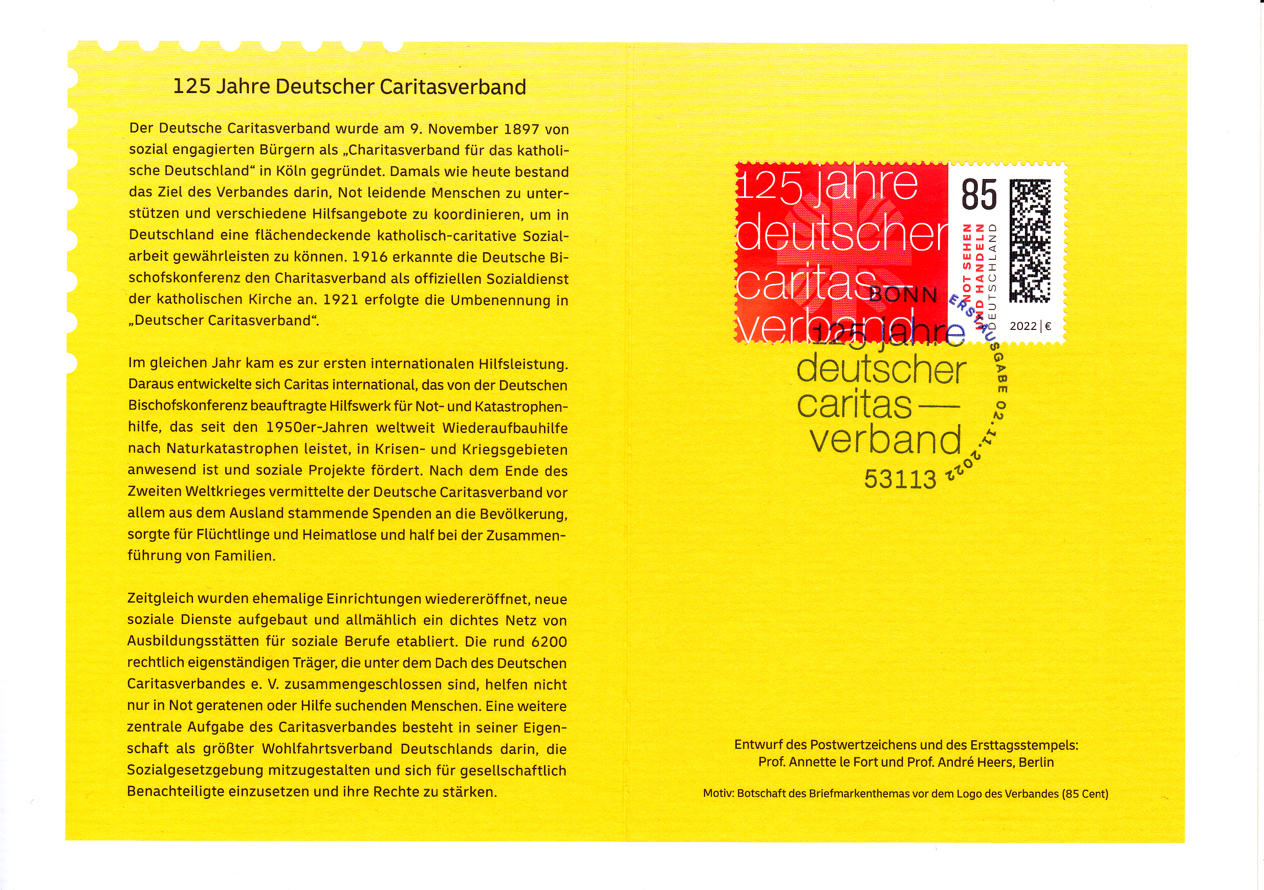 Klappkarte des Vorstandsvorsitzenden der Deutschen Post AG mit einer Marke (MiNr 3726) "125 Jahre Deutscher Caritasverband" und dem Ersttagsonderstempel Bonn.