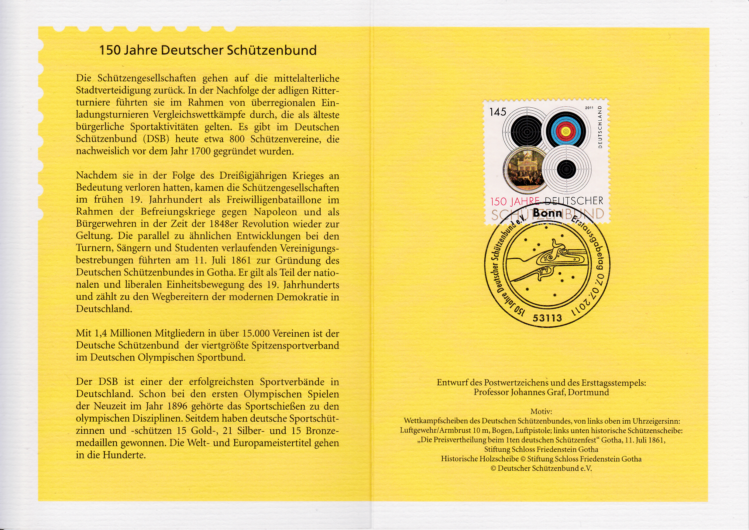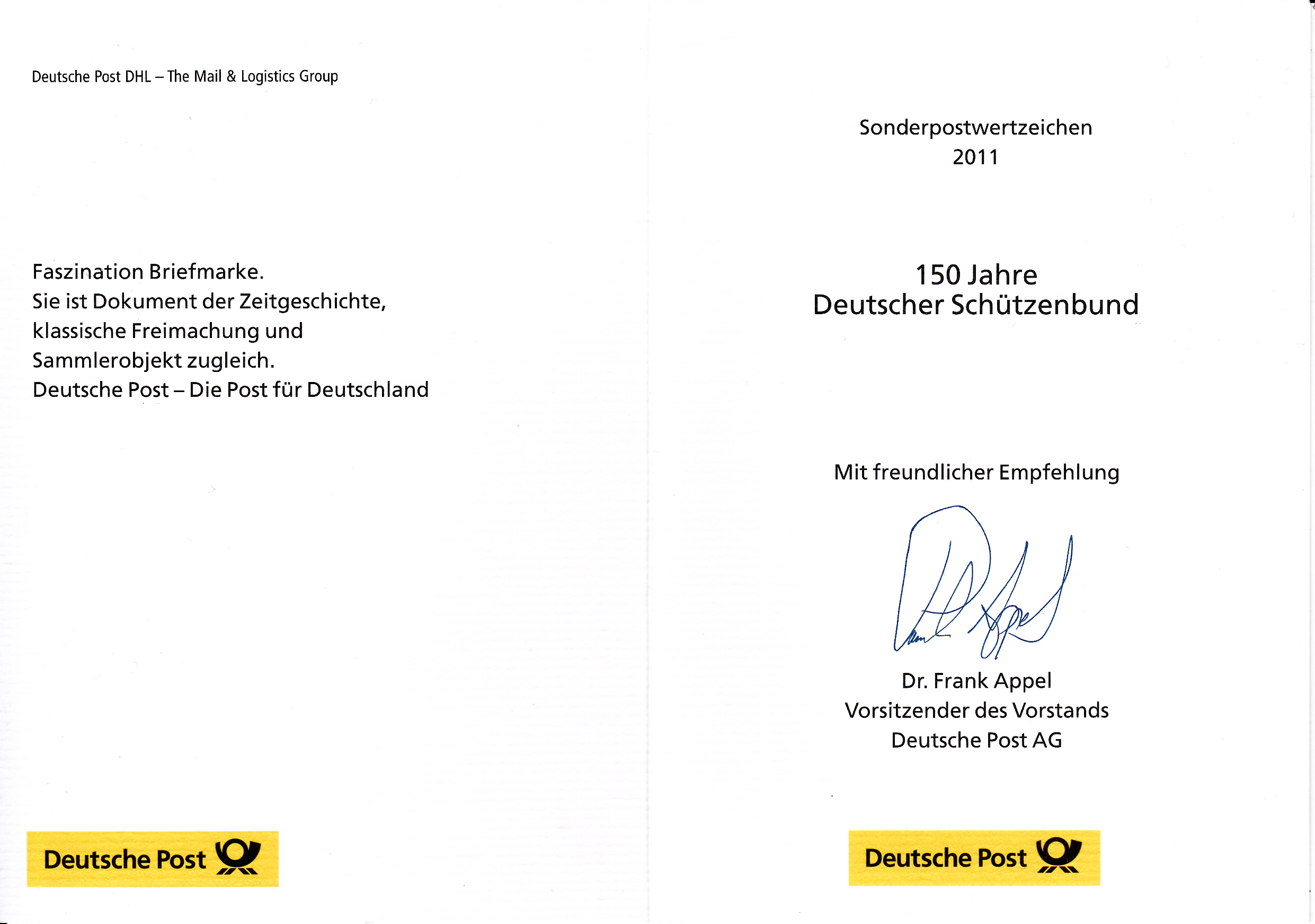 Klappkarte des Vorstandsvorsitzenden der Deutschen Post AG mit einer Marke zum Thema "150 Jahre Deutscher Schützenbund" (MiNr 2881) und dem Ersttagsonderstempel Bonn.