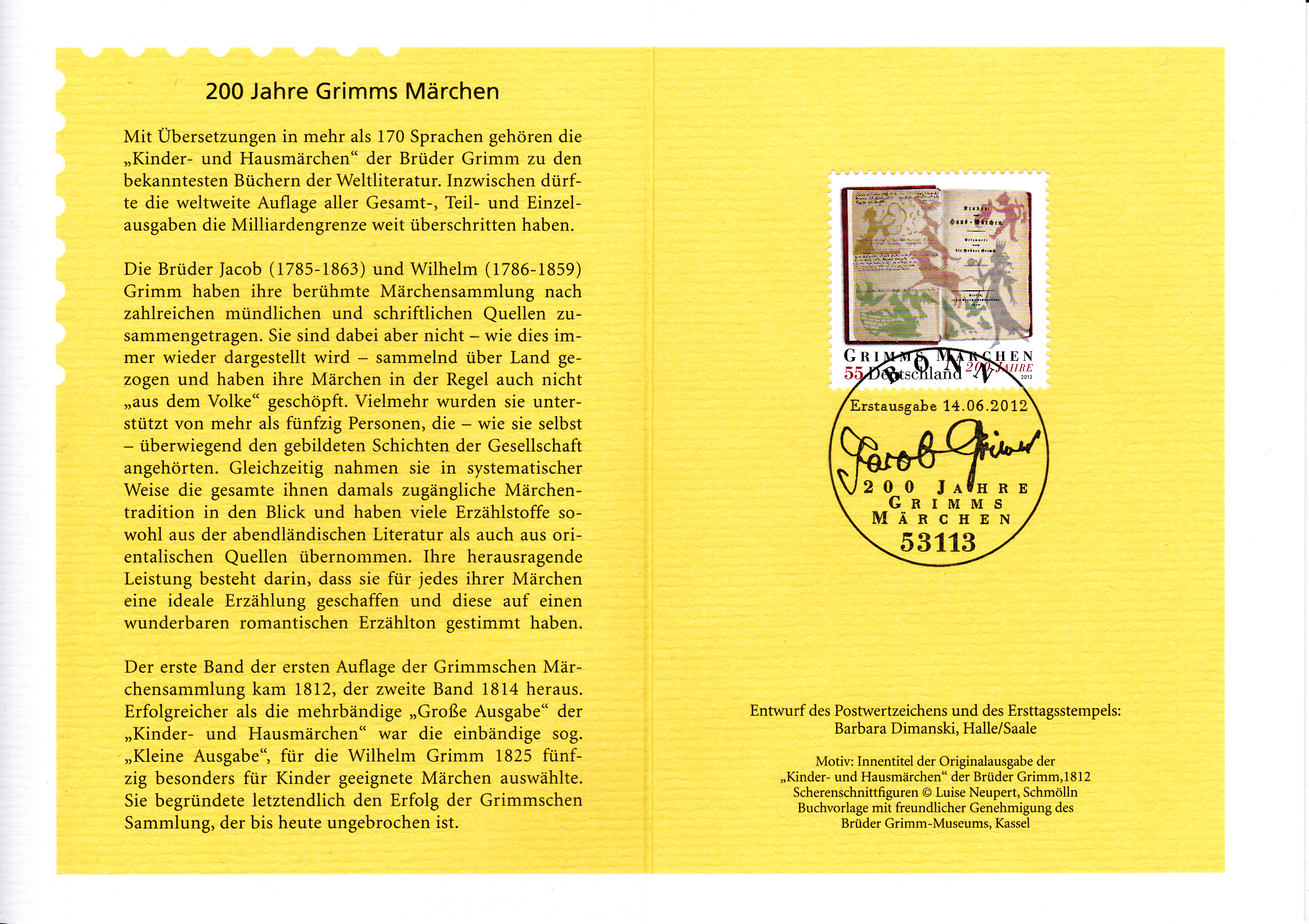 Klappkarte des Vorstandsvorsitzenden der Deutschen Post AG mit einer Marke zum Thema "200 Jahre Grimms Märchen" (MiNr 2938) und dem Ersttagsonderstempel Bonn.