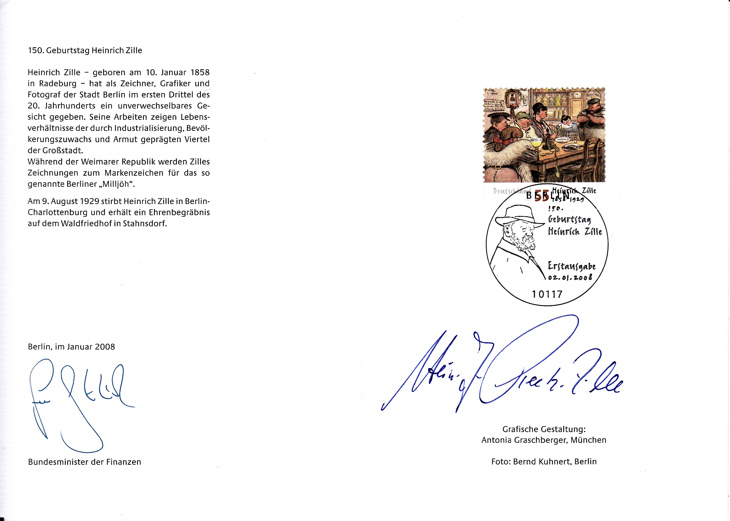 Ministerkarte mit der Marke zum 150. Geburtstag von Heinrich Zille und einer Unterschrift eines Enkel von Heinrich Zille.
