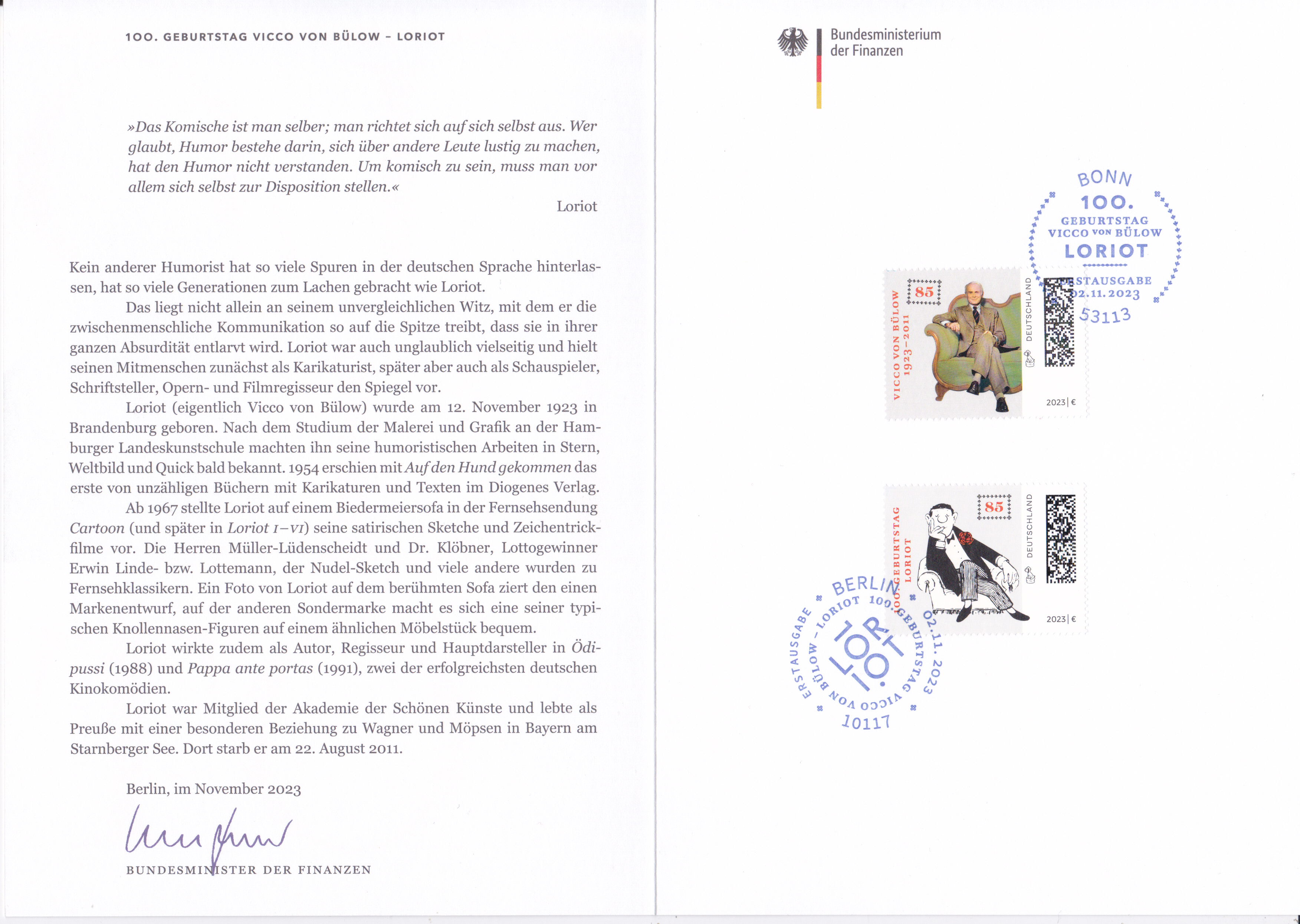 Ministerkarte des Bundesministers für Finanzen mit den beiden Marken (MiNr 3794 und 3795) zum 100. Geburtstag von Vicco von Bülow und den beiden Ersttagsonderstempel Bonn und Berlin.