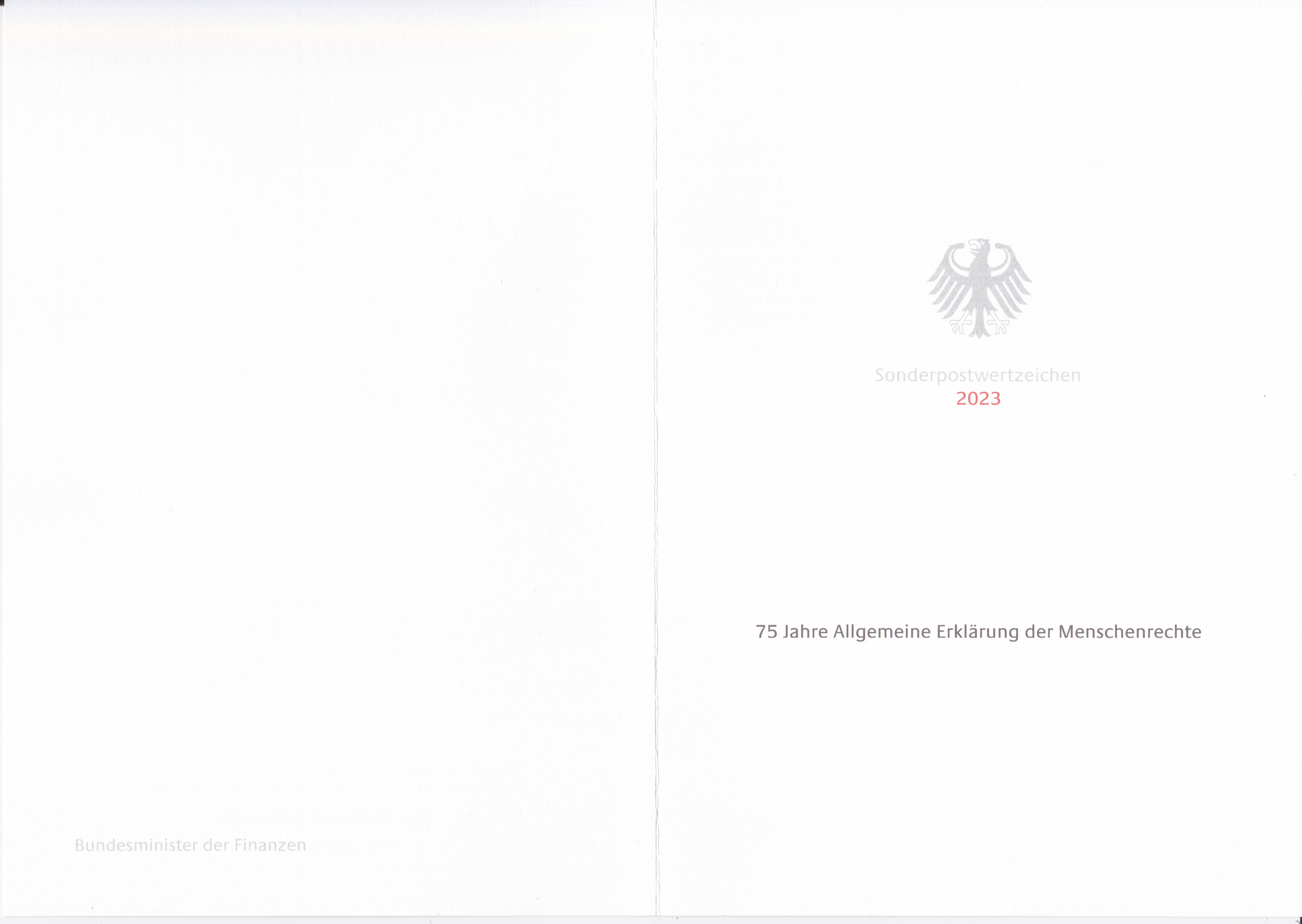 Ministerkarte des Bundesministers für Finanzen mit zwei Marken (MiNr 3805) "Allgemeine Erklärung der Menschenrechte vor 75 Jahren" und den beiden Ersttagsonderstempel Bonn und Berlin.
