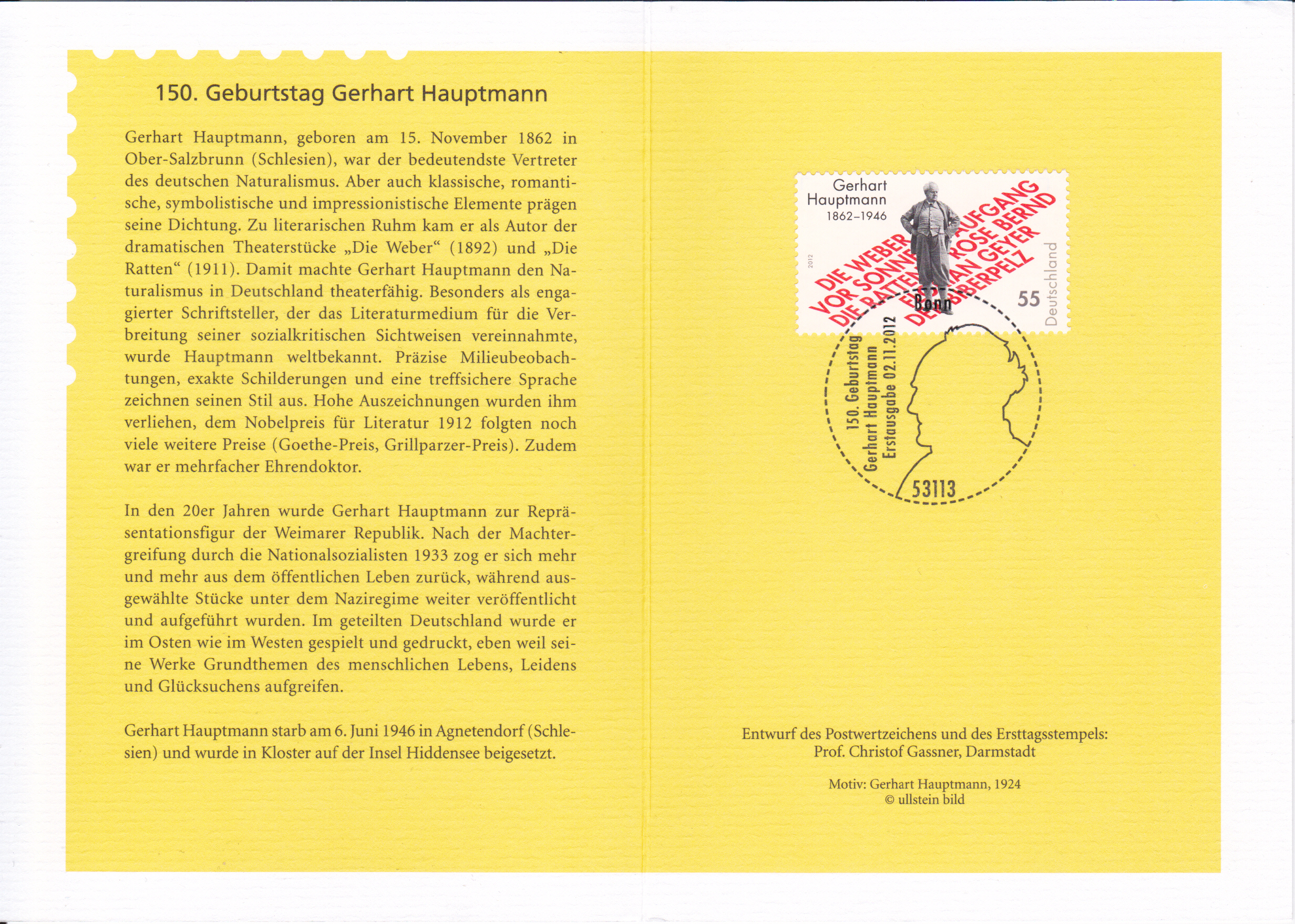 Klappkarte des Vorstandsvorsitzenden der Deutschen Post AG mit einer Marke (MiNr 2963) zum 150. Geburtstag von Gerhart Hauptmann und dem Ersttagsonderstempel Bonn.
