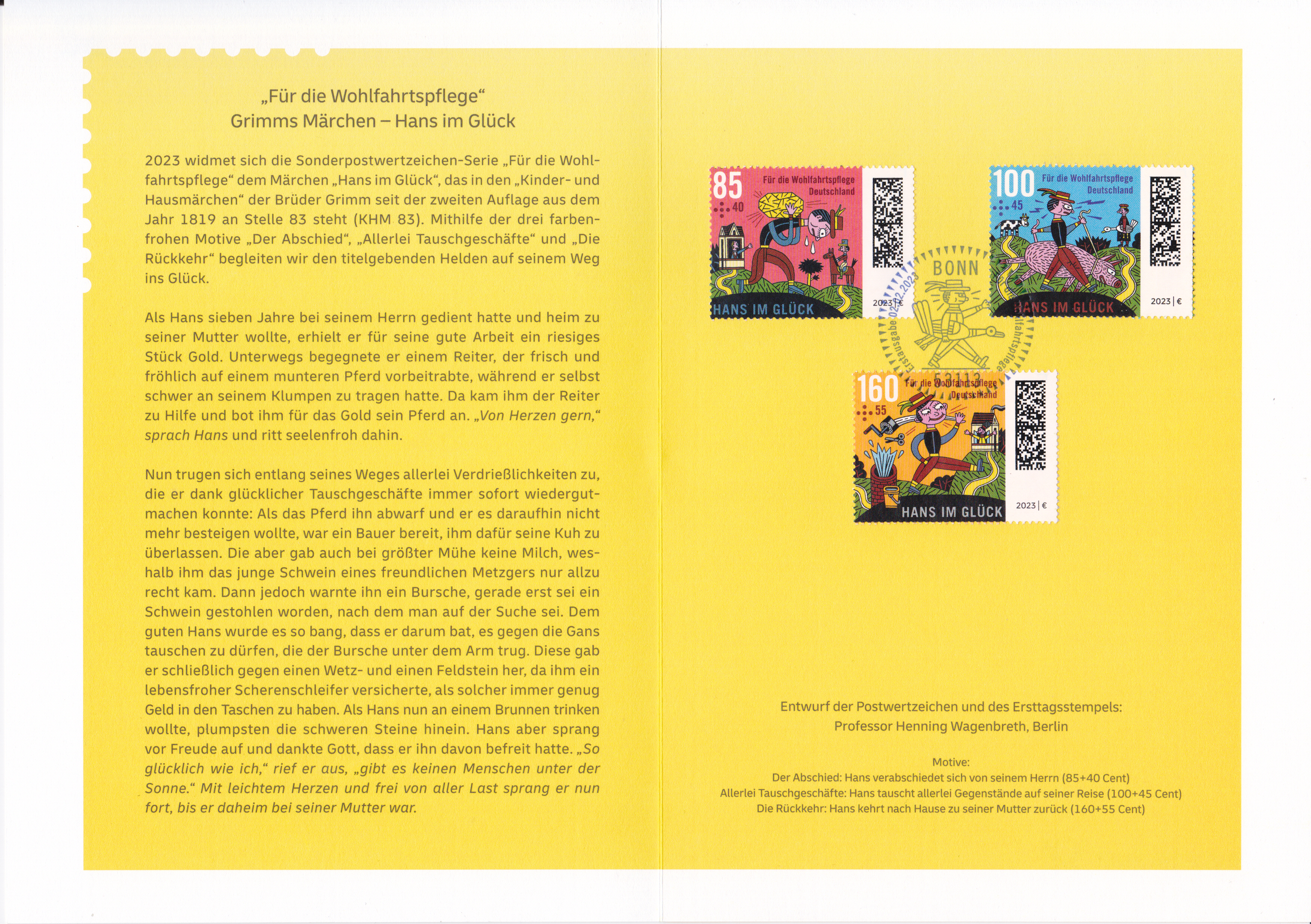 Klappkarte des Vorstandsvorsitzenden der Deutschen Post AG der Serie "Für die Wohlfahrt" 2023 (MiNr 3745 bis 3747) mit Motiven zum Märchen "Hans im Glück" und dem Ersttagsonderstempel Bonn.