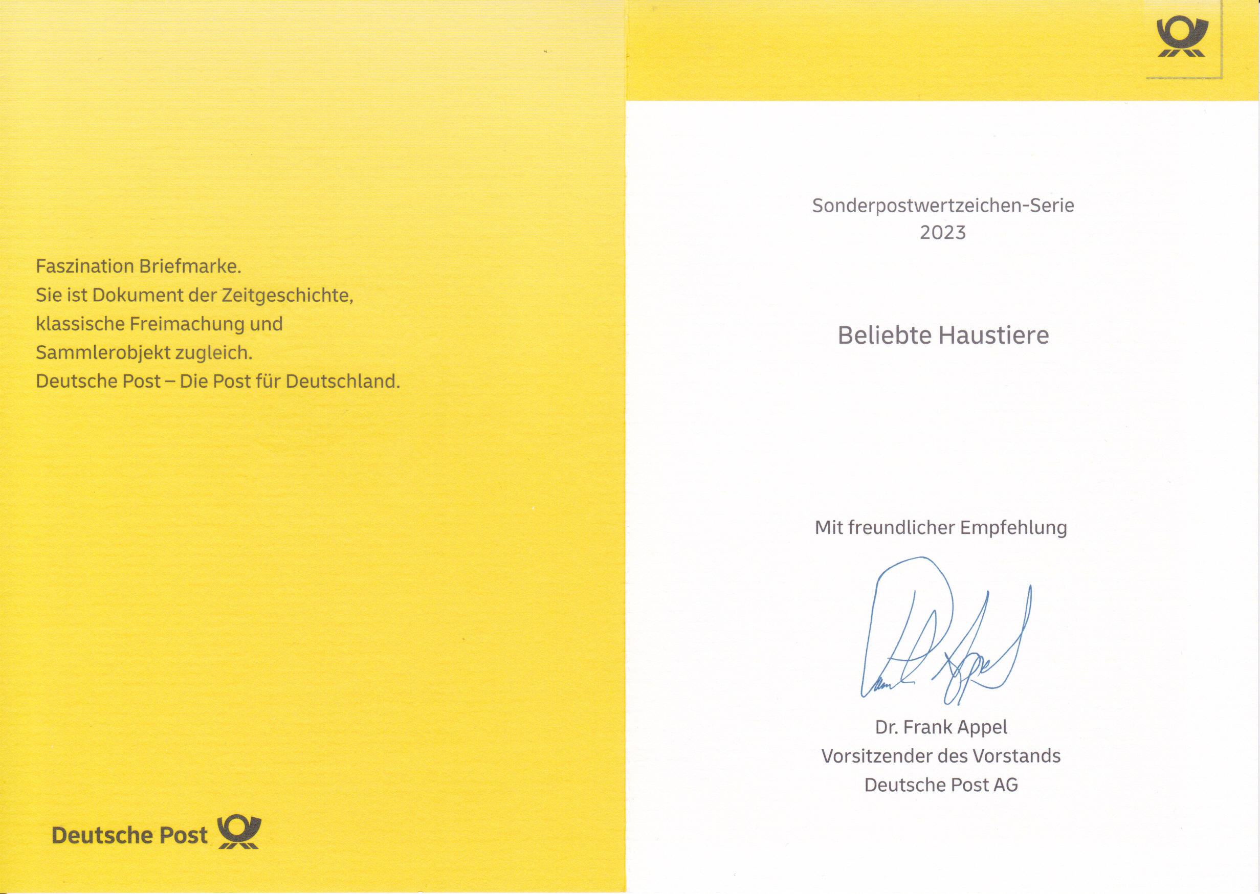 Klappkarte des Vorstandsvorsitzenden der Deutschen Post AG mit einer Marke (MiNr 3748) "Sibirische Katze (Felis catus)" aus der Serie "Haustiere" und dem Ersttagsonderstempel Bonn.
