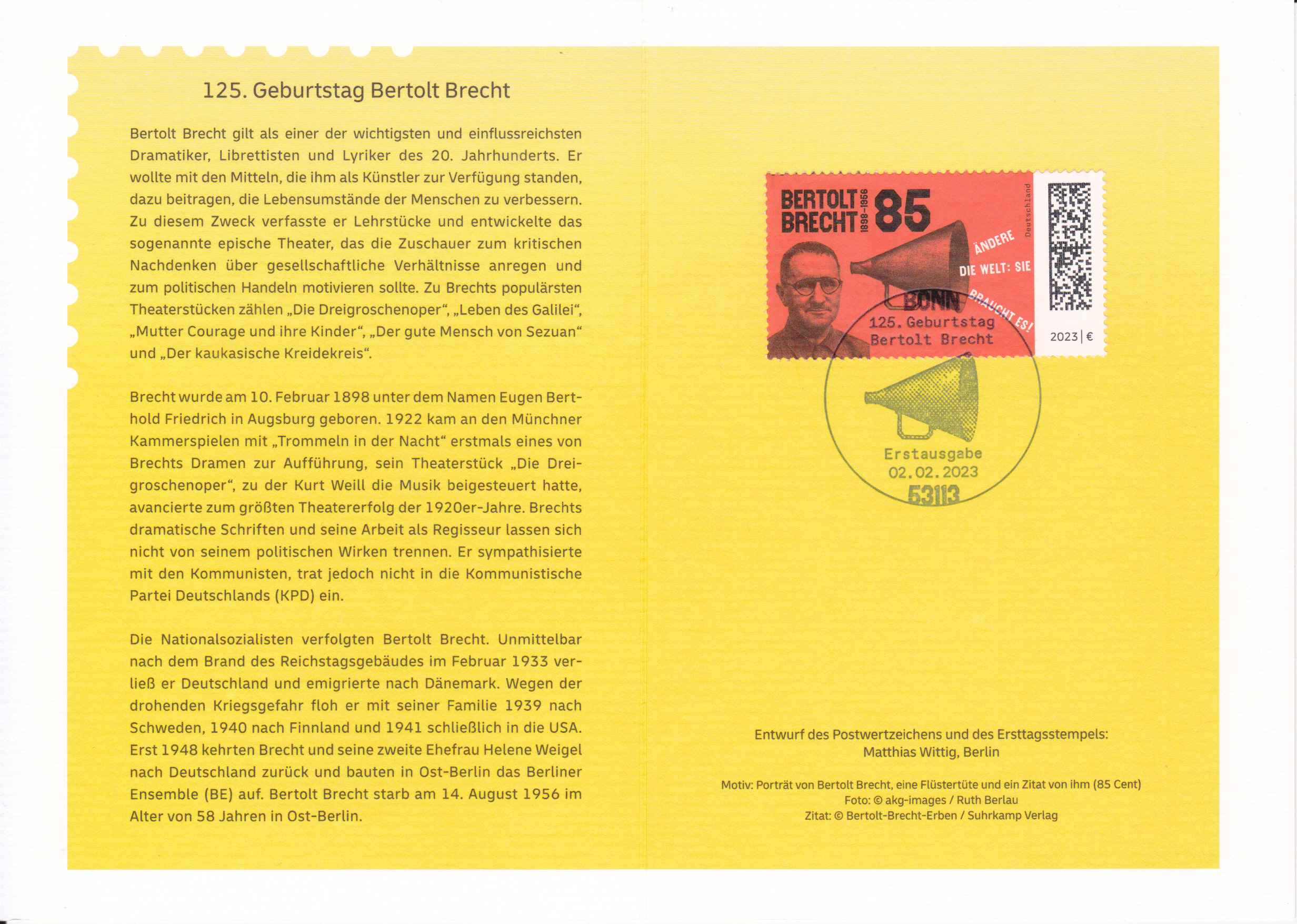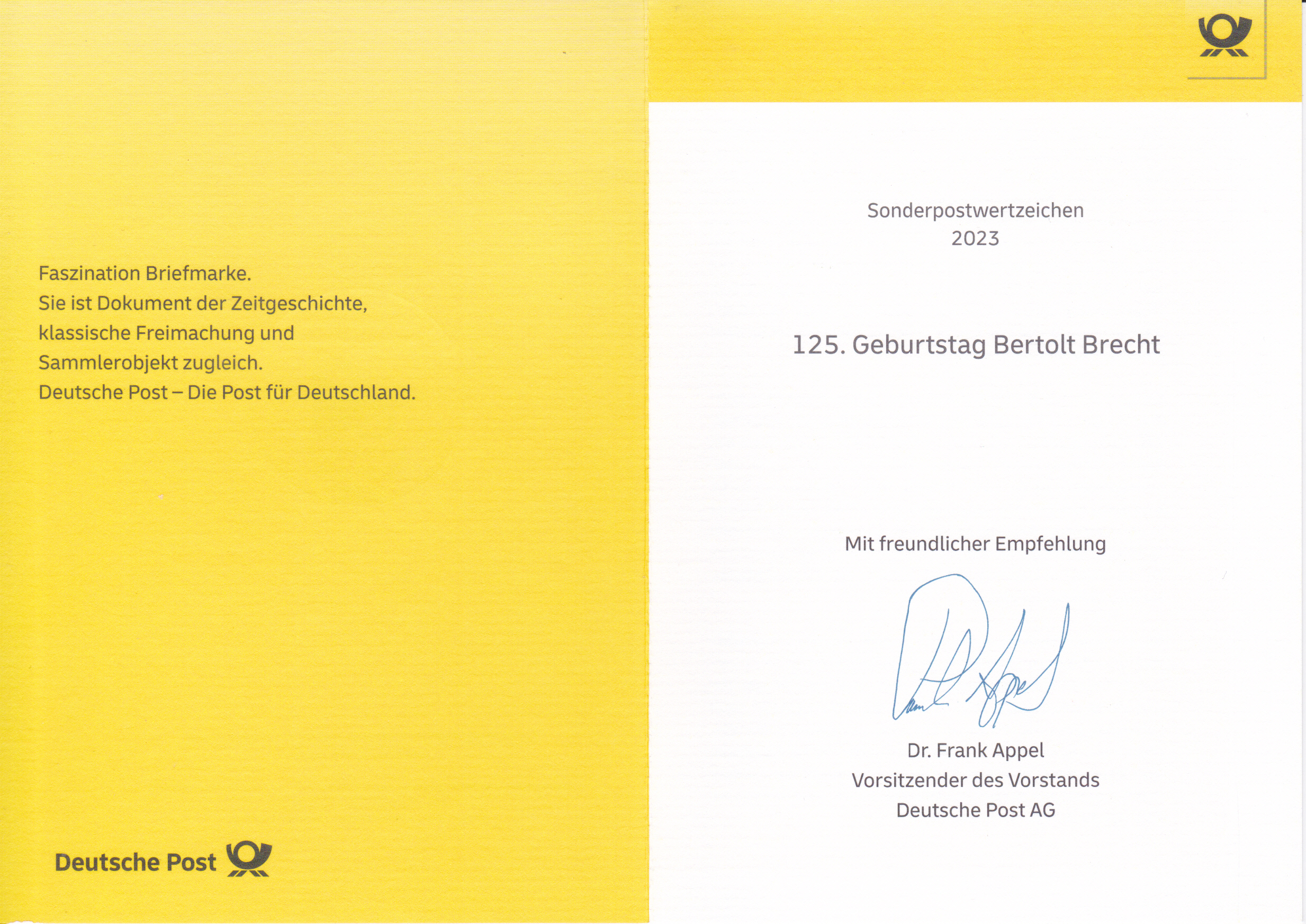Klappkarte des Vorstandsvorsitzenden der Deutschen Post AG mit einer Marke (MiNr 3749) zum 125. Geburtstag von Bertolt Brecht und dem Ersttagsonderstempel Bonn.