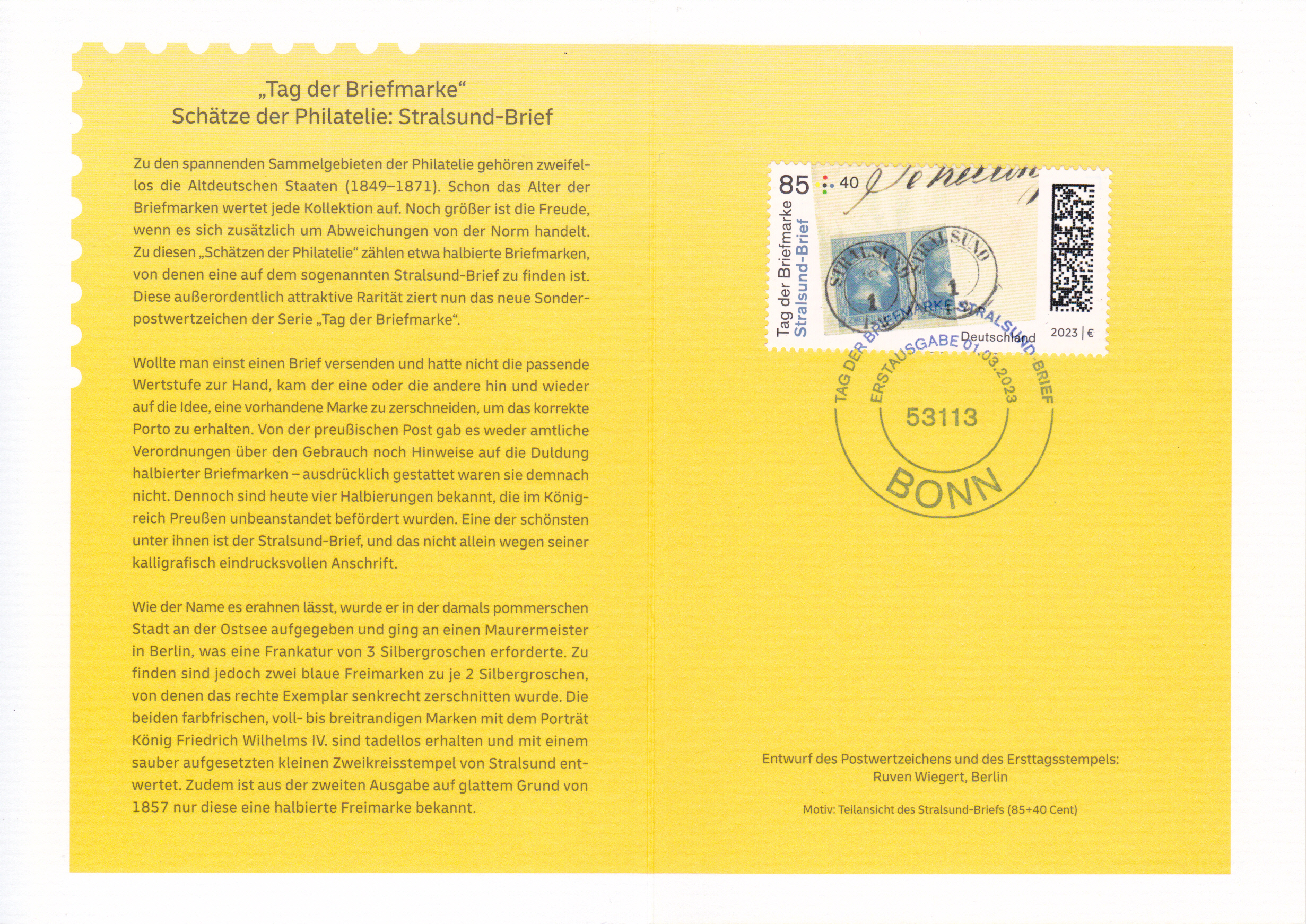 Klappkarte des Vorstandsvorsitzenden der Deutschen Post AG mit einer Marke (MiNr 3752) zum Tag der Briefmarke 2023 mit dem Stralsund-Brief und dem Ersttagsonderstempel Bonn.
