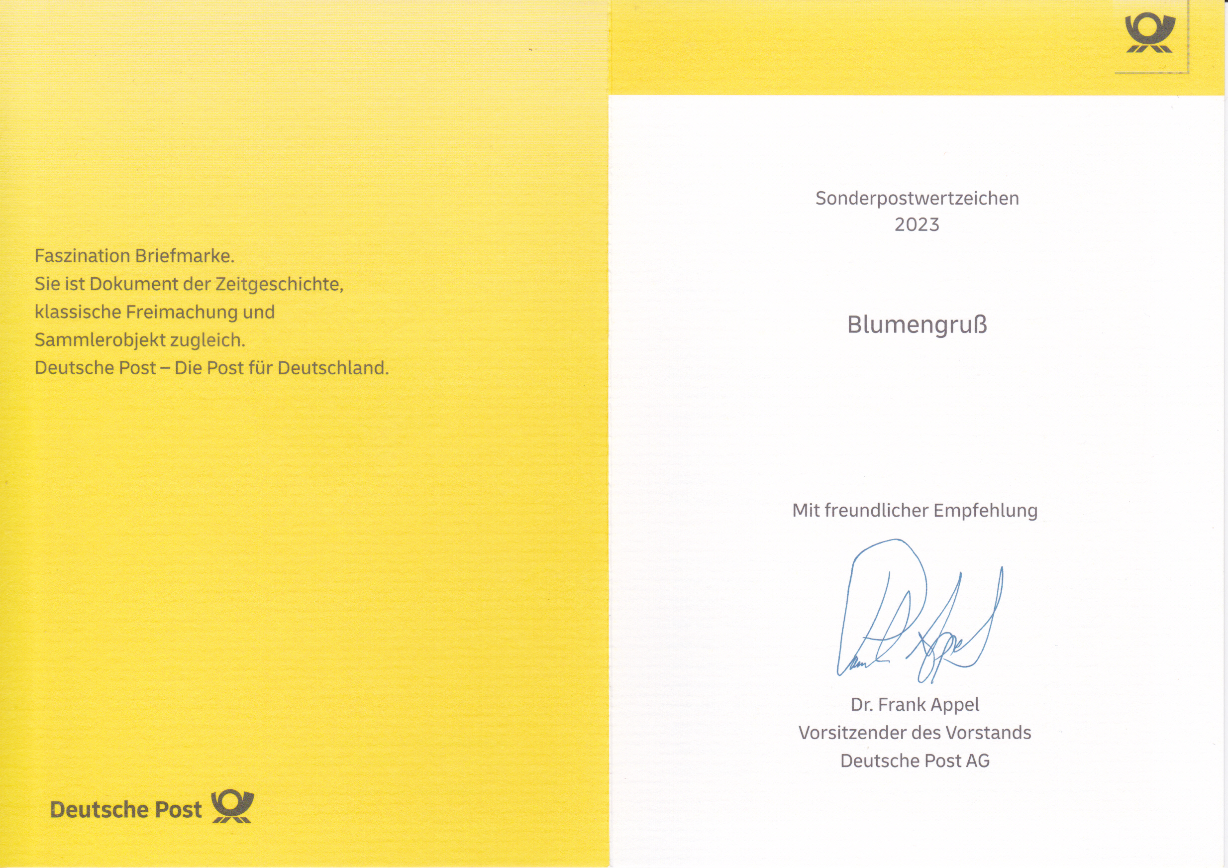 Klappkarte des Vorstandsvorsitzenden der Deutschen Post AG mit einer Marke (MiNr 3755) "Blumengruß" und dem Ersttagsonderstempel Bonn.