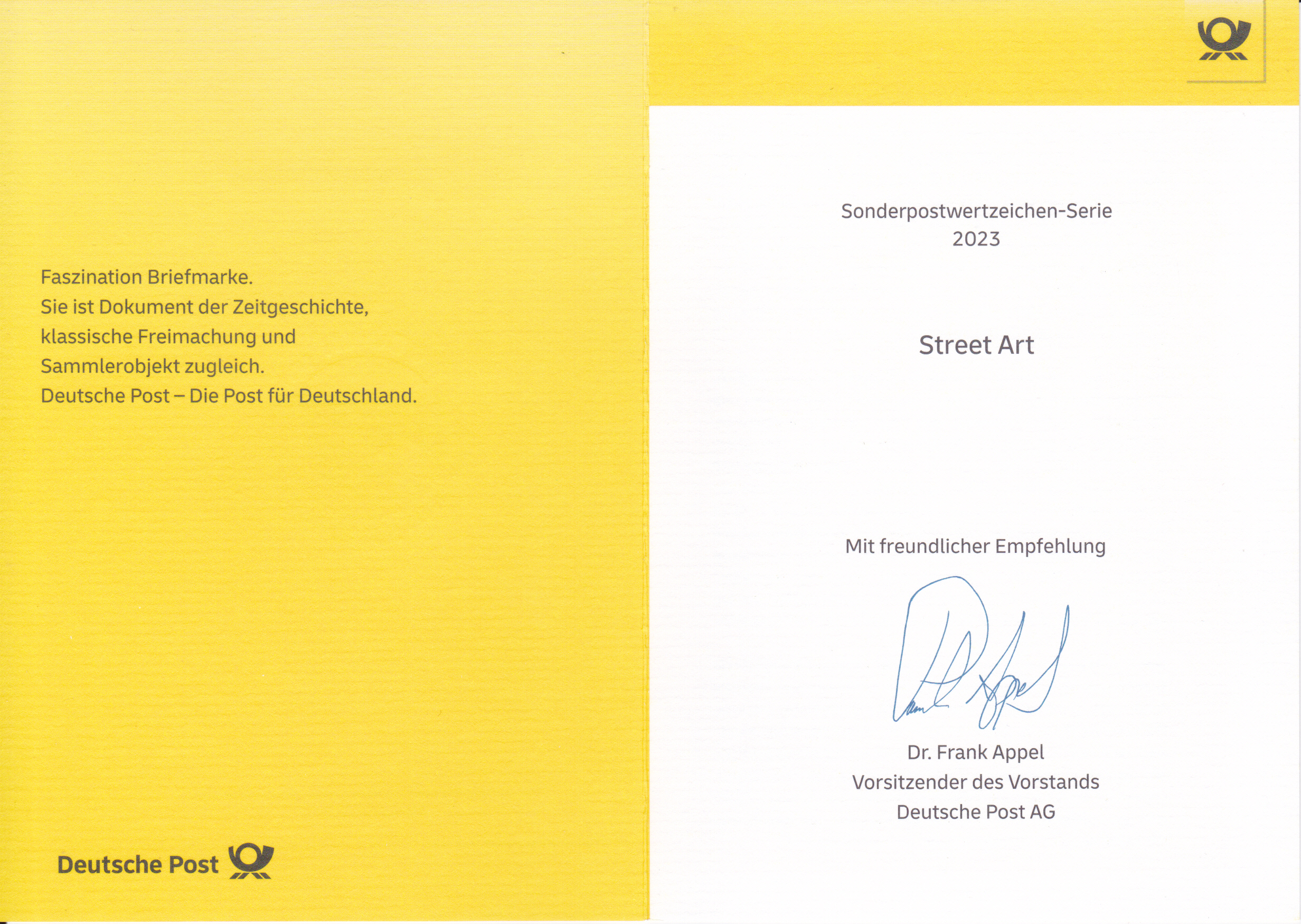 Klappkarte des Vorstandsvorsitzenden der Deutschen Post AG mit einer Marke "Wandmalerei 'New Wave'!" von Christoph Schmidt (geb.1984) und Florin Schmidt (geb.1982) alias "!Low Bros", deutsche Graffiti-Künstler aus der Serie "Street Art"(MiNr 3758) und dem Ersttagsonderstempel Bonn.