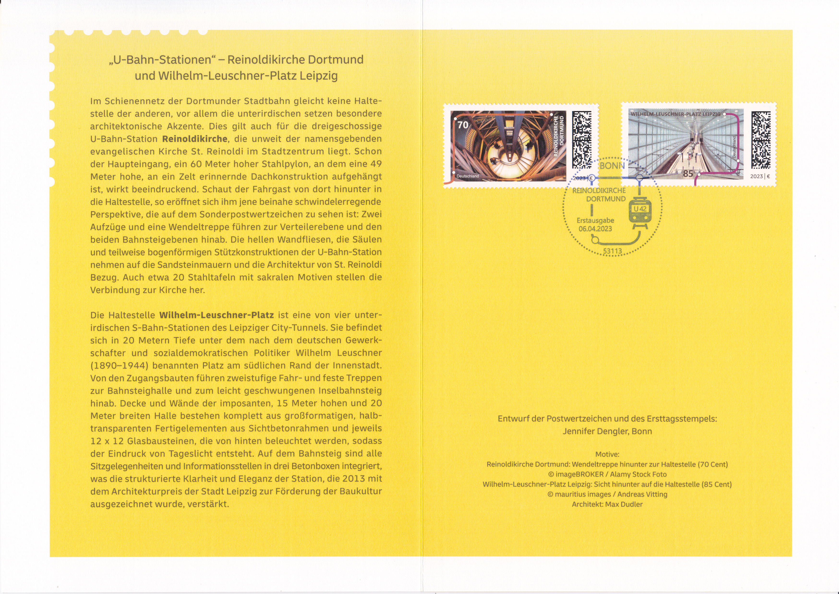 Klappkarte des Vorstandsvorsitzenden der Deutschen Post AG mit je einer Marke "U-Bahn-Haltestelle Reinoldikirche, Dortmund" und "U-Bahn-Haltestelle Wilhelm-Leuschner-Platz, Leipzig" aus der Serie "U-Bahn-Stationen" (MiNr 3759 und 3760) und dem Ersttagsonderstempel Bonn.